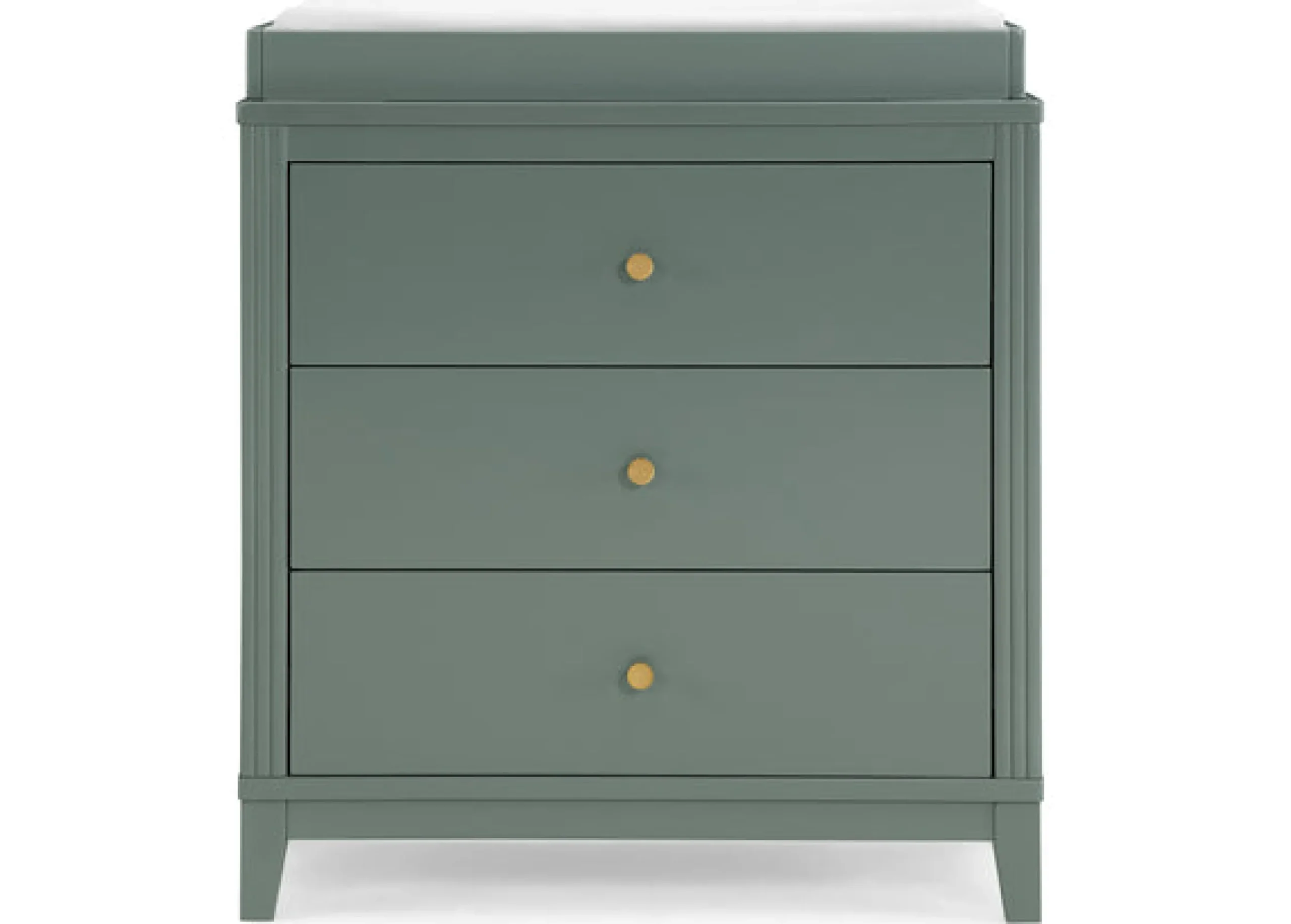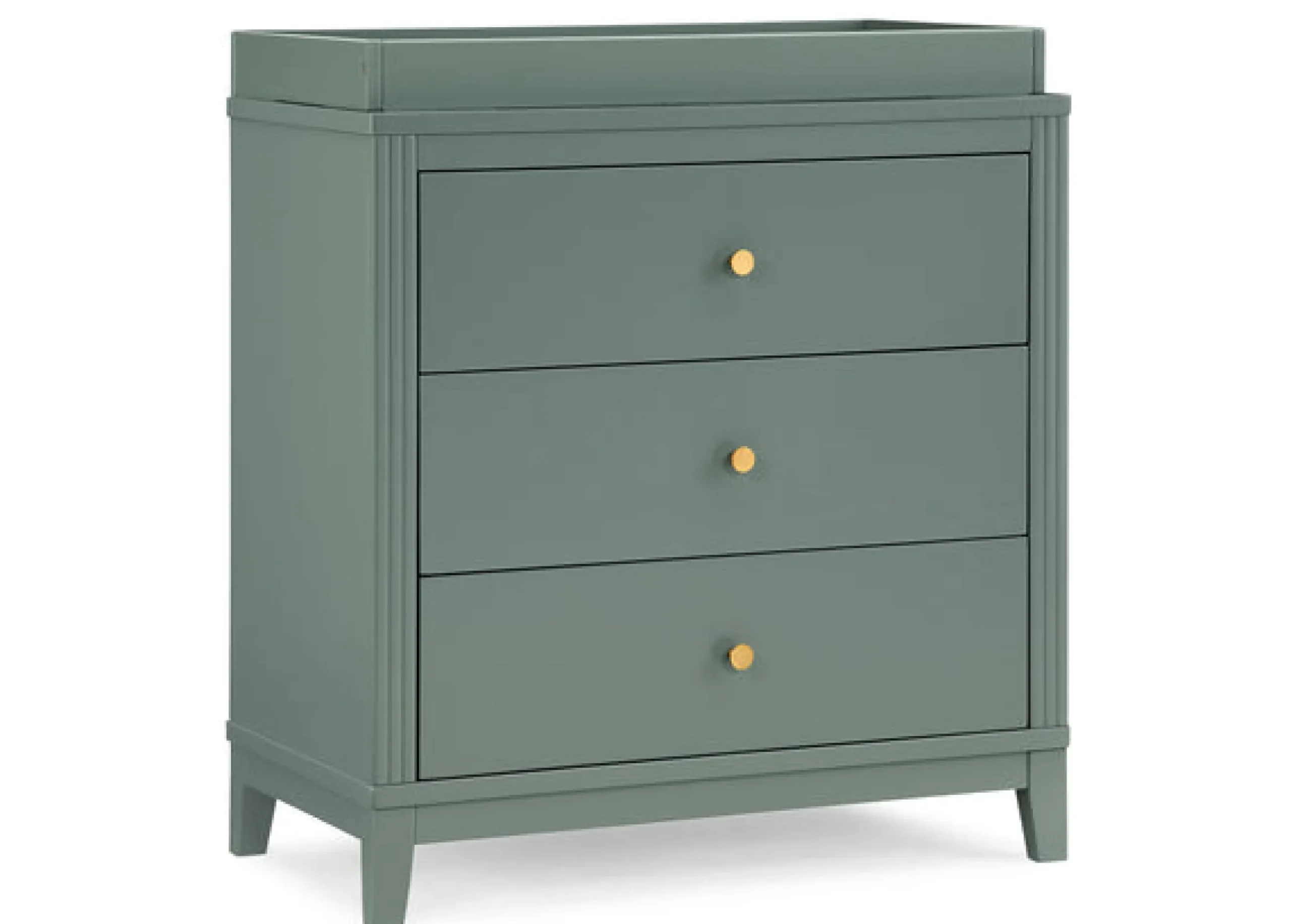 The Eloise 3 Drawer Dresser with Changing Top by Delta Children is an elegant mix of classic style and contemporary touches. It makes a dramatic statement with its antique brass knobs and modern silhouette. Designed to effortlessly grow with your child, this spacious storage piece serves as a sturdy changing table too, with the included changing topper (changing pad sold separately). When your child grows, just remove the topper, it easily transitions into a stand-alone dresser. For your child’s safety, this dresser is outfitted with an interlocking drawer system that limits the number of drawers that can be opened at one time. Available in Bianca White, Moonstruck Grey, Midnight Grey and Grassy Glen. To complete the look, pair this dresser with the coordinating Eloise 4-in-1 Convertible Crib.