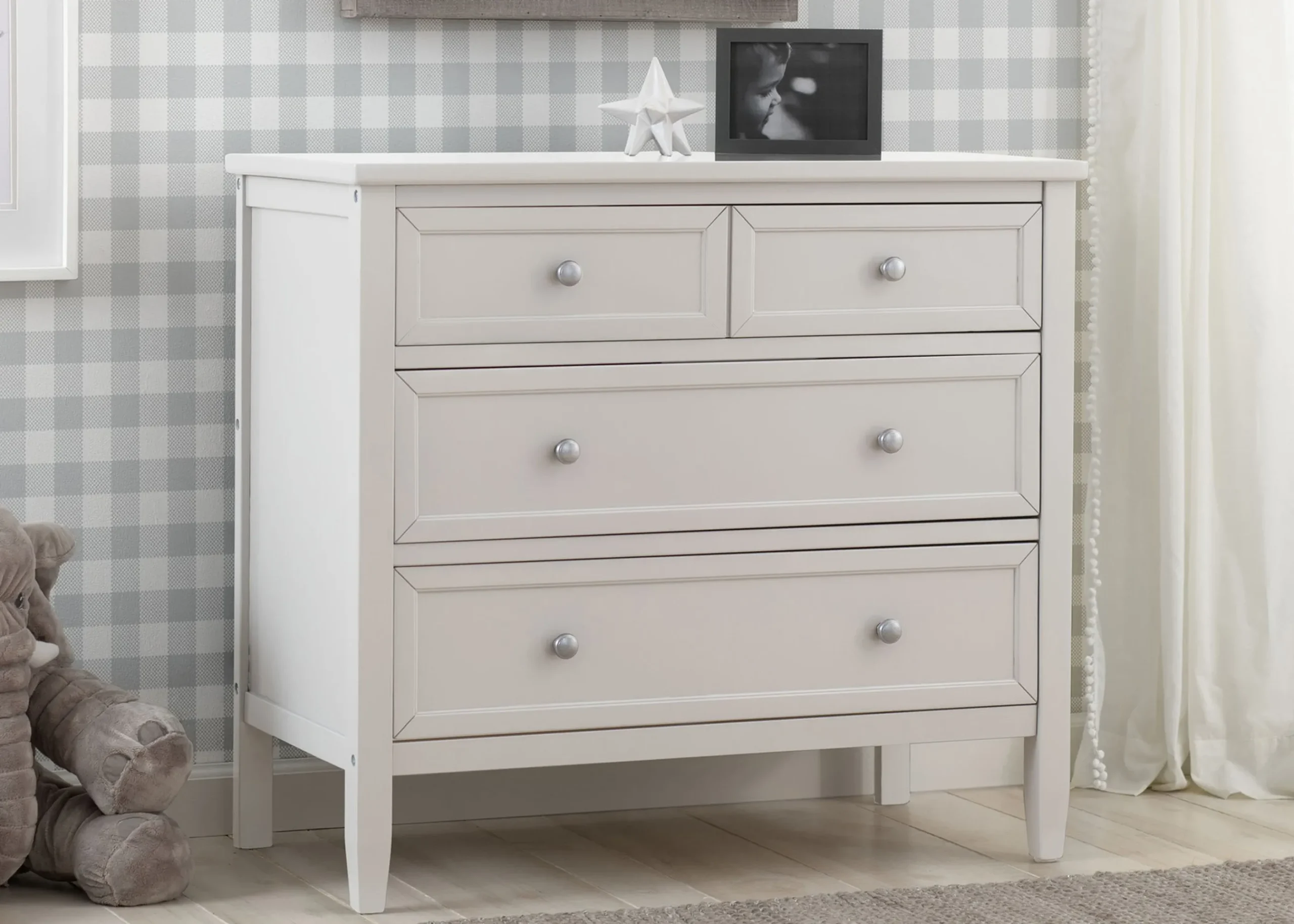 The Epic Place 3 Drawer Dresser with Interlocking Drawers by Delta Children is a spacious storage option that has ample room to store baby’s clothes through the years. Featuring metal hardware and square tapered legs, it’s finished with a wide top at the just-right height to hold a lamp or display cherished photos or mementos. Pair it with the coordinating Changing Topper #0550 (sold separately) to convert your dresser into a convenient changing table. For your child’s safety, this dresser is outfitted with an interlocking drawer system that limits the number of drawers that can be opened at one time. This Delta Children dresser is tested to meet the current requirements of ASTM F2057, the mandatory CPSC safety standard that protects young children from furniture tip-over incidents. For your children’s safety, only purchase dressers that comply with this standard. For additional security, Delta Children strongly recommends that all dressers in your home be anchored; all Delta dressers include a wall anchor. To learn how to properly secure your dresser, please see the product assembly instructions or visit our website.
