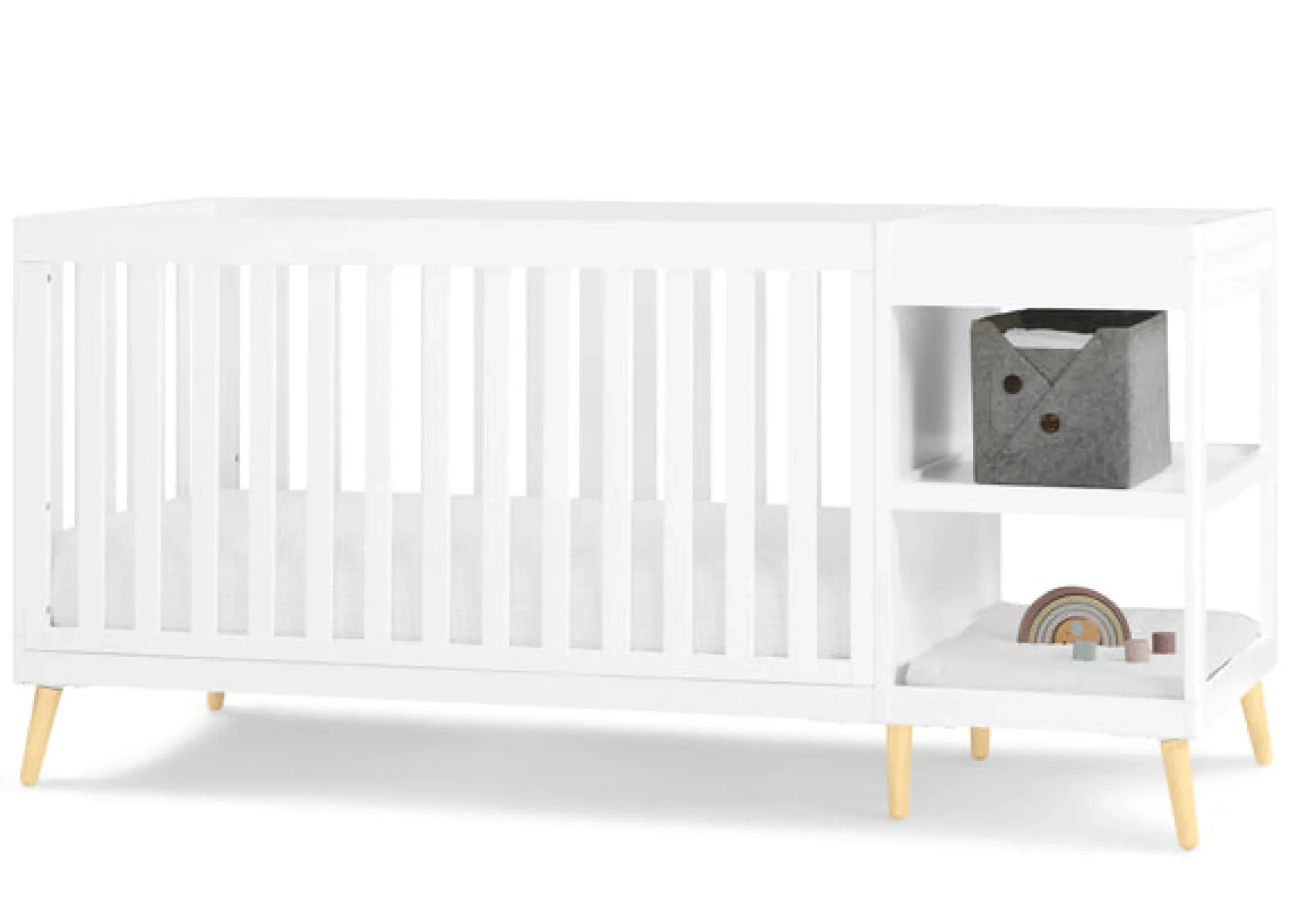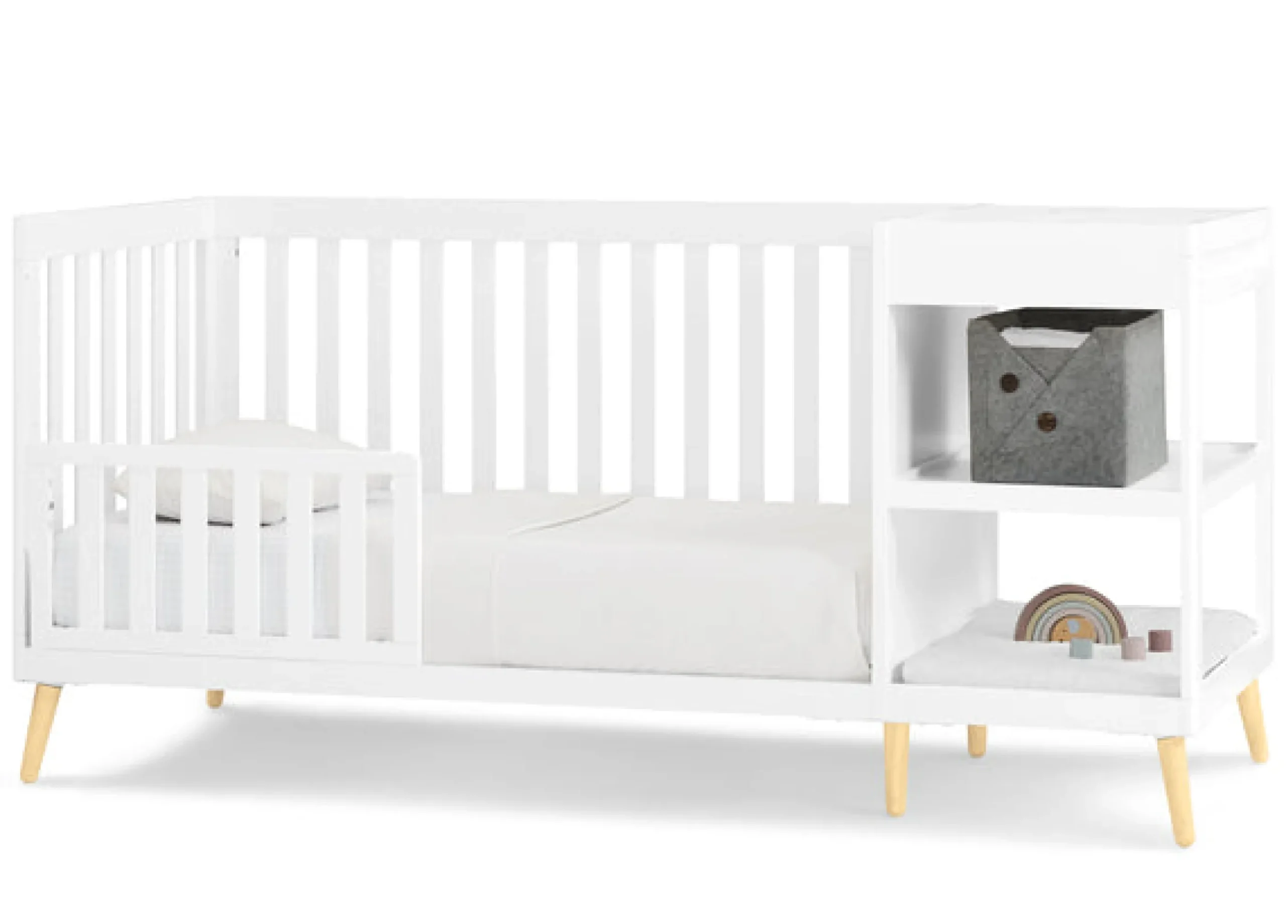 The Essex 4-in-1 Convertible Crib and Changer by Delta Children is designed to elevate modern nurseries. It features gently curved corners and splayed feet for some retro cool style. A versatile crib and changer combo that provides everything you need for baby in one convenient package, this crib features an attached changing table that provides a comfortable surface to change and dress baby, plus two spacious shelves where you can keep necessities nearby. The adjustable mattress height allows this crib to grow alongside your little one—start with the mattress at the highest level, then lower it as your baby begins to sit or stand. Once your child outgrows the crib, convert it to a toddler bed, daybed or sofa (Daybed/Sofa Rail included, Toddler Guardrail W100825 sold separately). To complete your mid-century modern nursery, pair the Essex 4-in-1 Convertible Crib and Changer with other items in the Essex Collection by Delta Children.