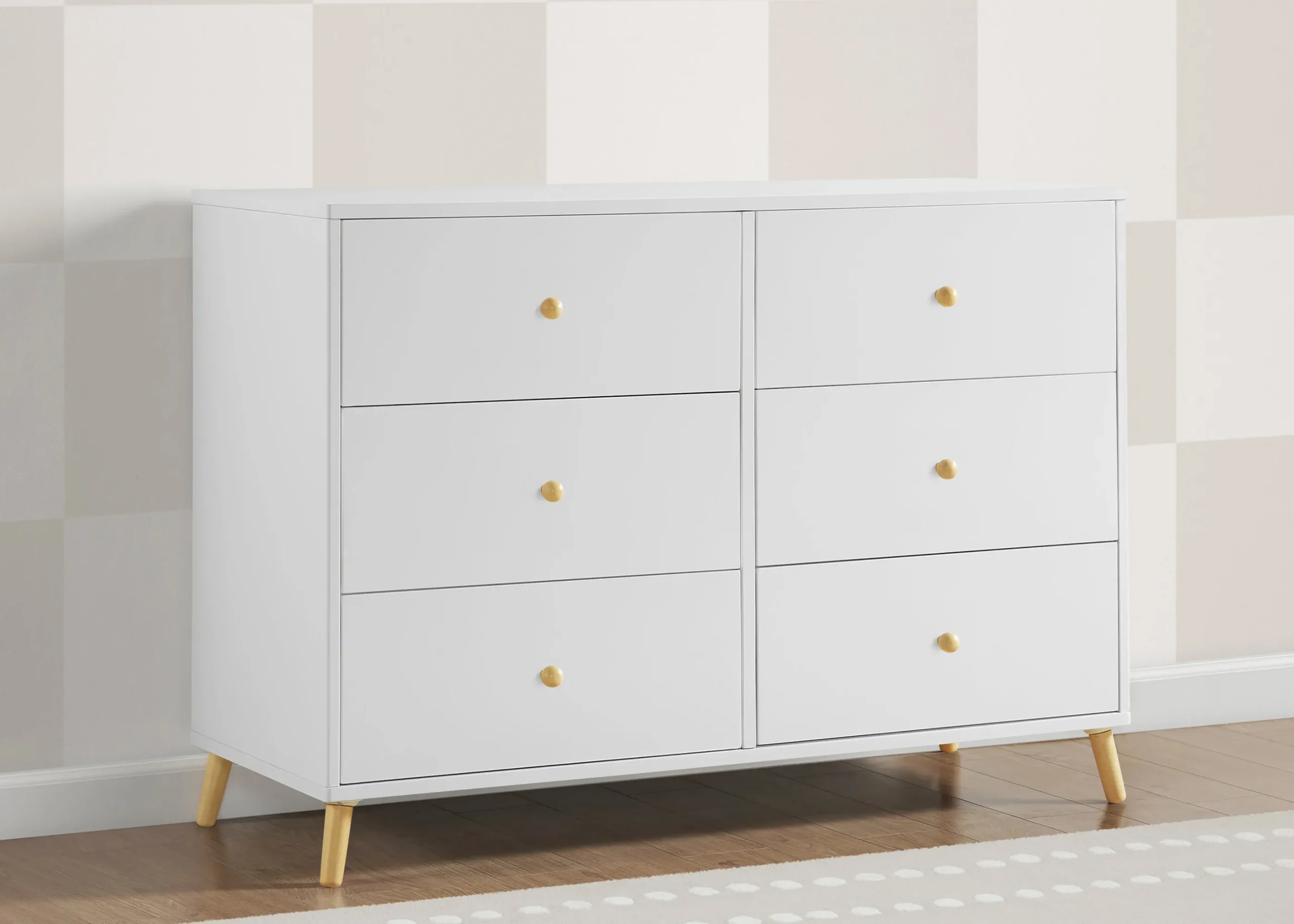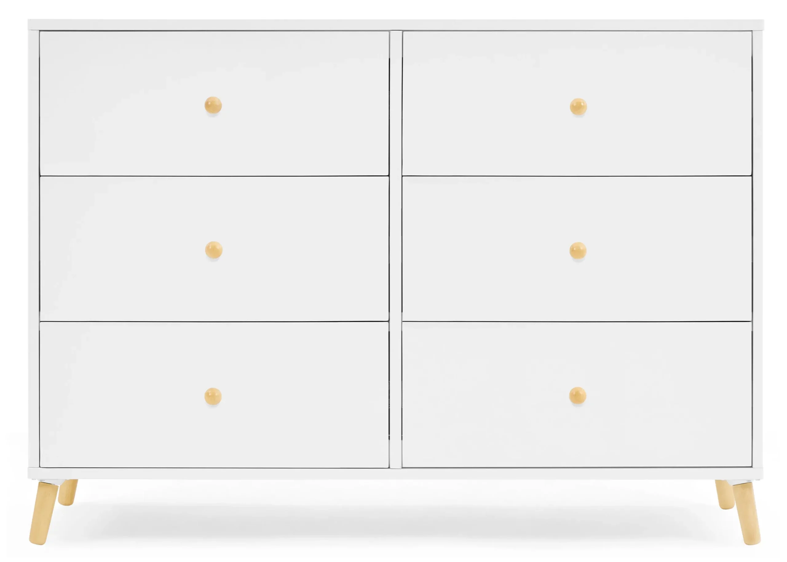 The Essex 6 Drawer Dresser by Delta Children is a must-have storage unit for stylish parents and kids! Designed to elevate modern nurseries or bedrooms, it is the perfect accompaniment to your Essex 4-in-1 Crib with its angled feet and two-toned detailing. With six spacious drawers, this sturdy dresser provides a range of practical storage possibilities to suit all your needs. For your child’s safety, this dresser is outfitted with an interlocking drawer system that limits the number of drawers that can be opened at one time. Available in Bianca White/Natural and Black/Natural. Coordinates with other items in the Essex Nursery Furniture Collection by Delta Children.This dresser is tested to meet the current requirements of ASTM F2057, the mandatory CPSC safety standard that protects young children from furniture tip-over incidents. For your children’s safety, only purchase dressers that comply with this standard. For additional security, Delta strongly recommends that all dressers in your home be anchored; all Delta dressers include a wall anchor. To learn how to properly secure your dresser, please see the product assembly instructions or visit our website.