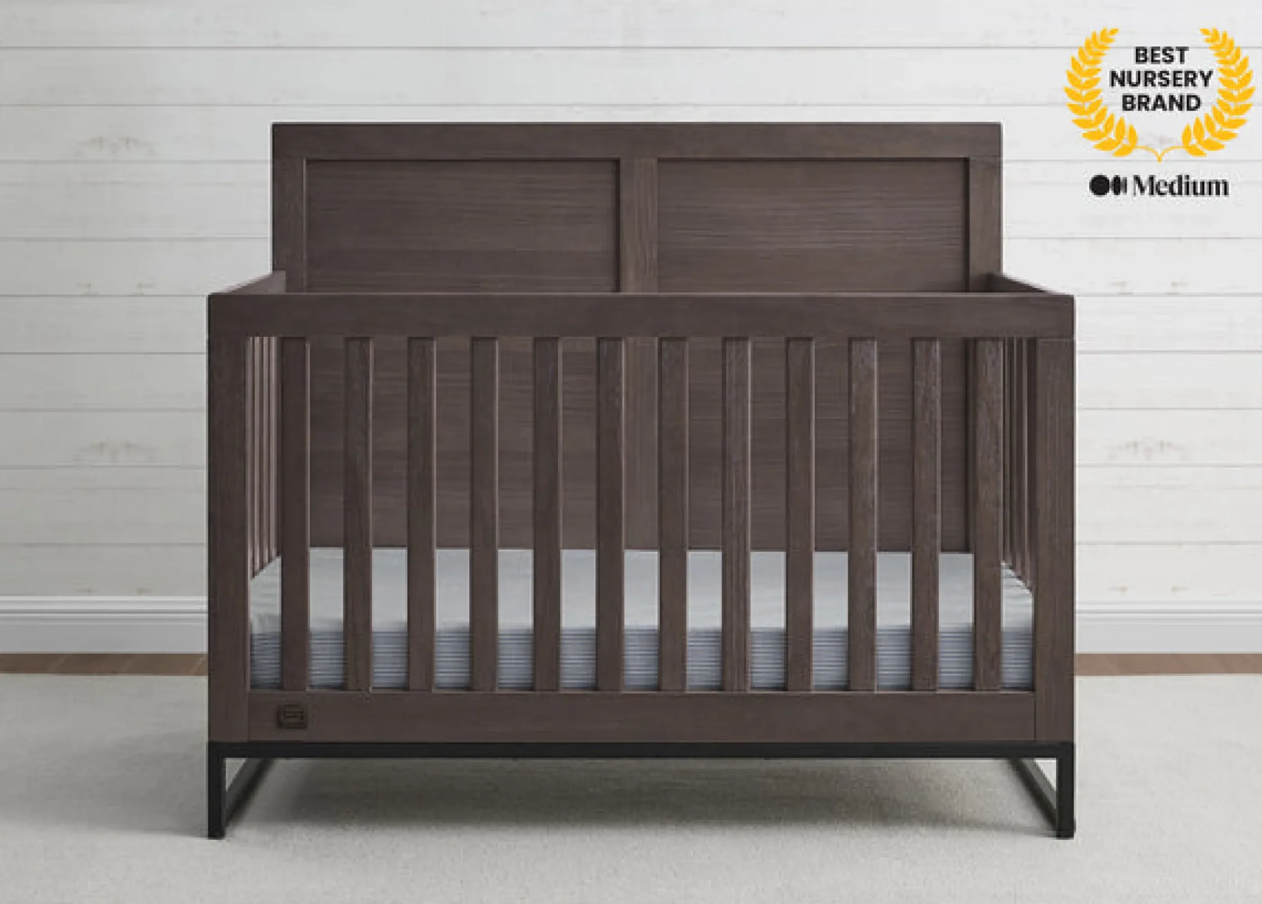 A true mix of rustic and modern, this baby crib features a softy textured finish that’s hand applied and a sleek, matte black metal base