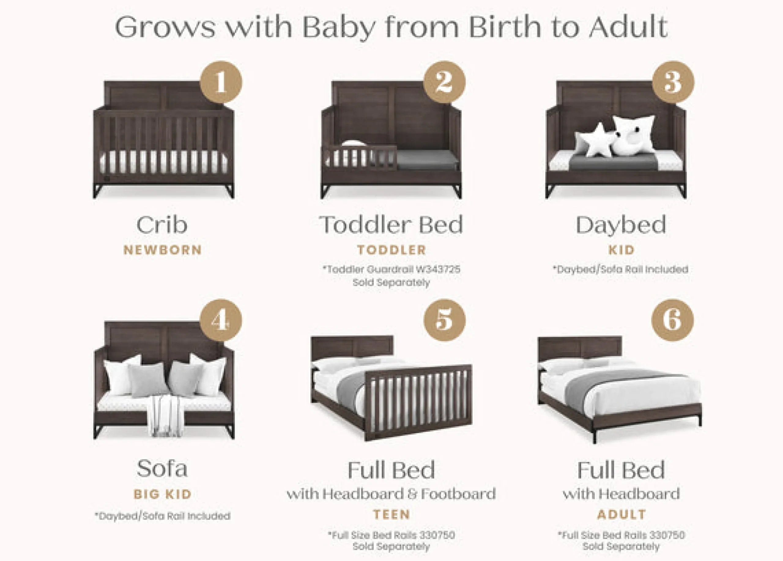 - Crib converts to toddler bed, daybed, sofa, full size bed with headboard and footboard and full size bed with headboard and low footboard (Daybed/Sofa Rail included; Toddler Guardrail #W343725 and Full Size Bed Rails #330750 sold separately)
