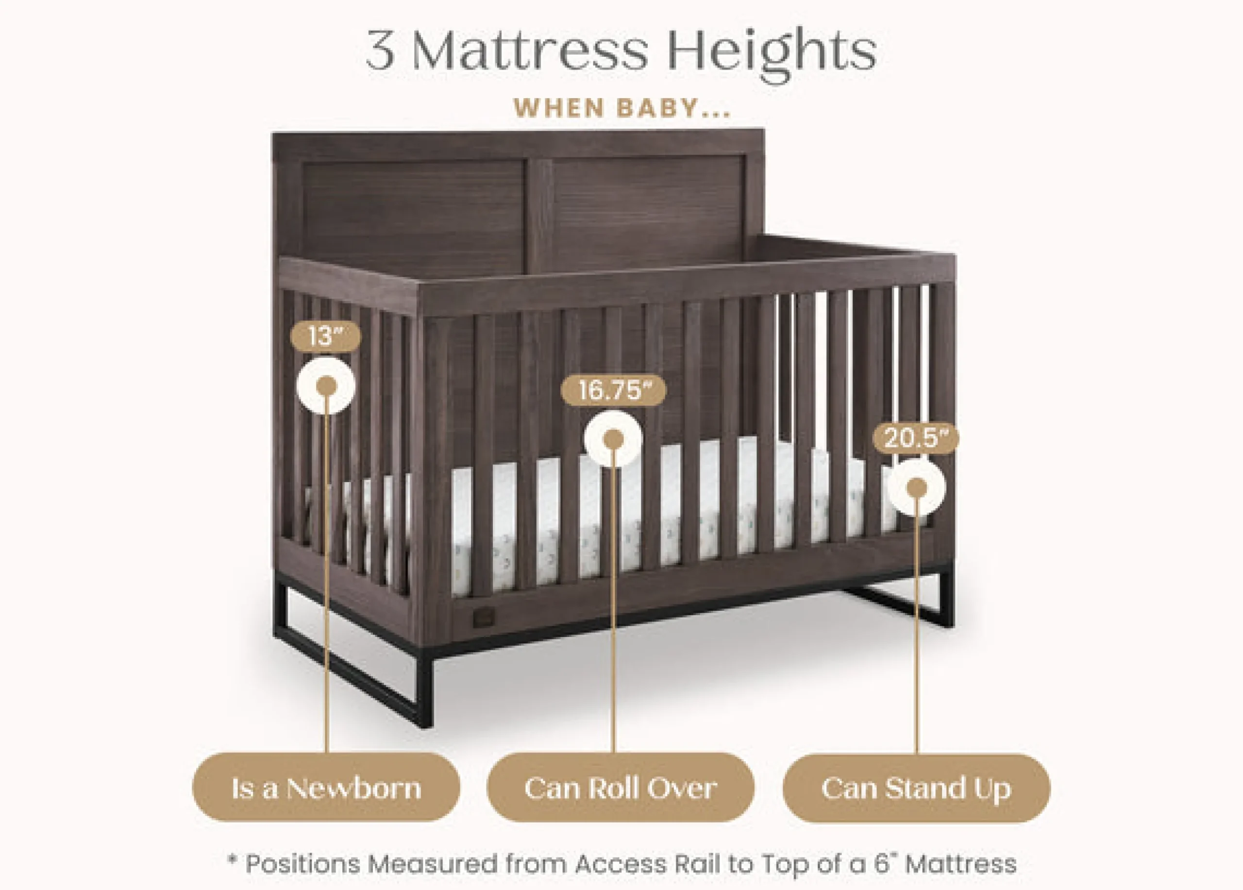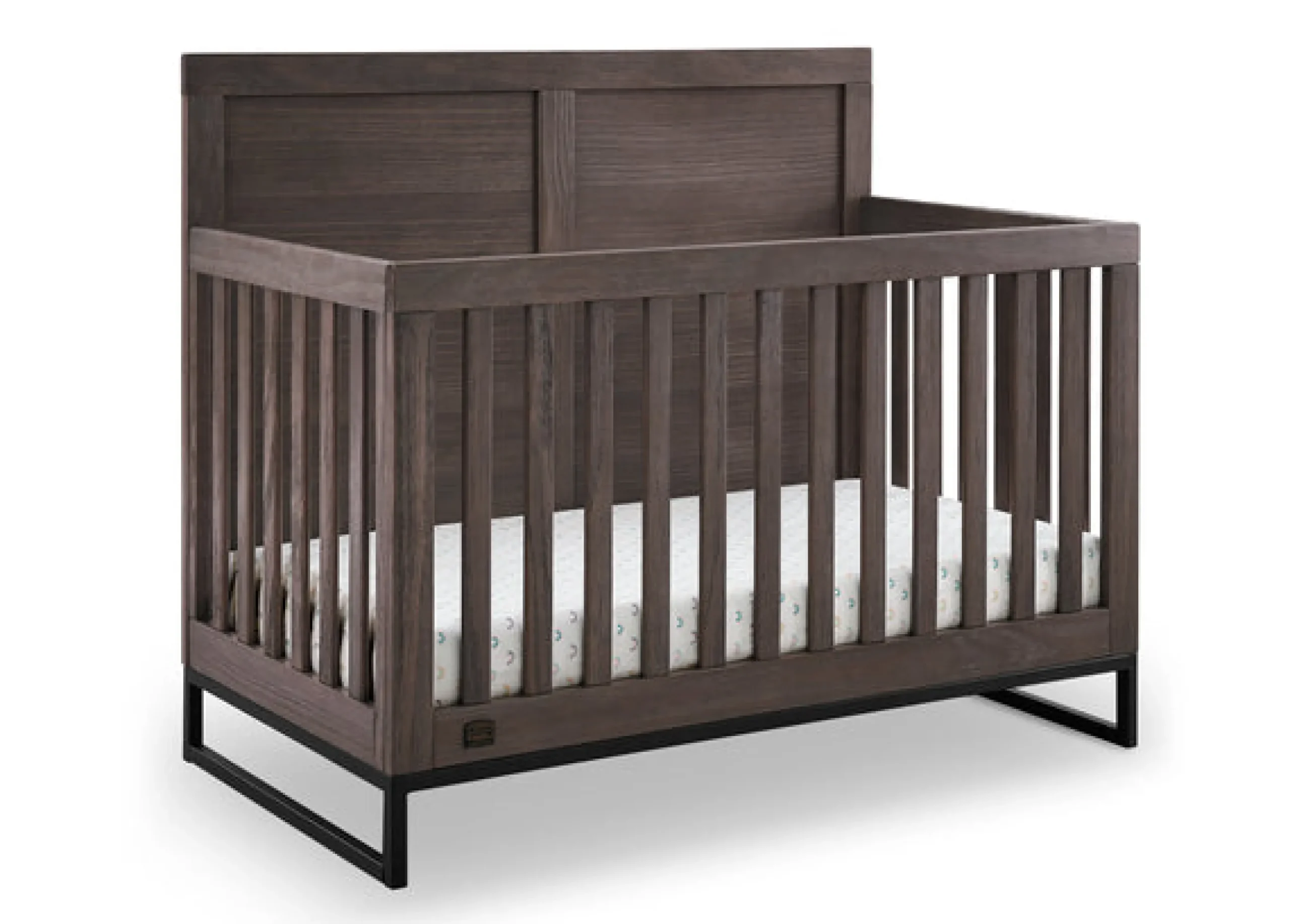 The Foundry 6-in-1 Convertible Crib by Simmons Kids is designed to be a lasting piece of furniture from your child’s baby years well into grade school. A true mix of rustic and modern, this baby crib features a softy textured finish that’s hand applied and a sleek, matte black metal base. The adjustable height mattress allows the Foundry Crib to grow alongside your little one—start with the mattress at the highest level, then lower it as your baby begins to sit or stand. Once your child outgrows the crib, convert it to a toddler bed, daybed, sofa, full size bed with headboard and footboard or full size bed with headboard and low footboard (Daybed/Sofa Rail included, Toddler Guardrail #W343725 and Full Size Bed Rails #330750 sold separately). Given the hand applied nature of this baby crib’s finish, variations in the wood are to be expected and celebrated. To complete your nursery, pair the Foundry 6-in-1 Convertible Crib with the Foundry 4 Drawer Dresser with Changing Top by Simmons Kids.