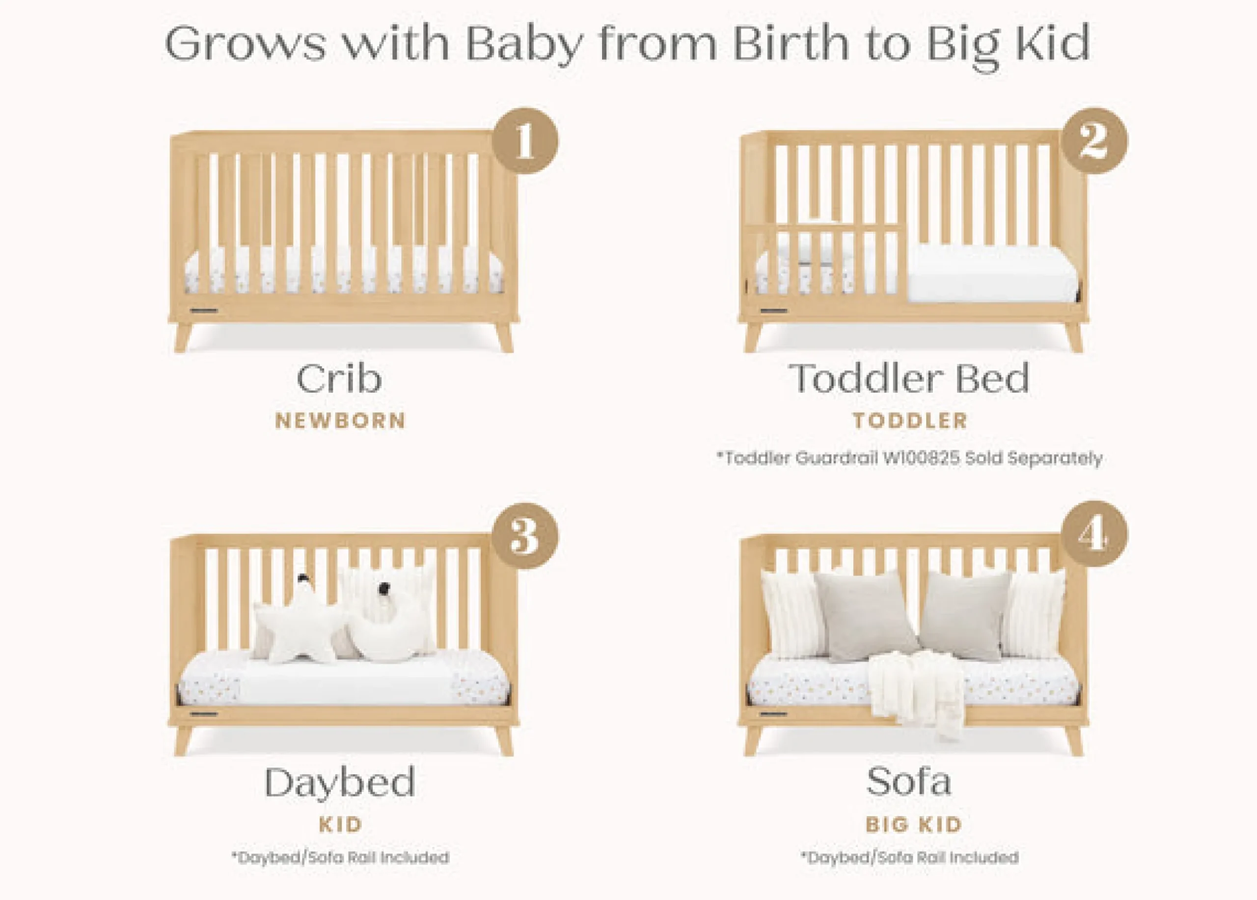 - Crib converts to a toddler bed, daybed and sofa (Daybed/Sofa Rail Included – Toddler Guardrail #W100825 sold separately)