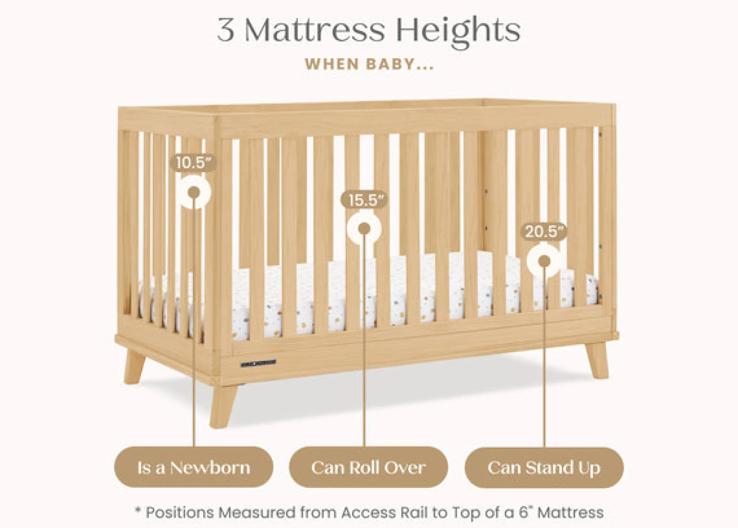 - Adjustable height mattress support with 3 convenient positions to grow with your baby