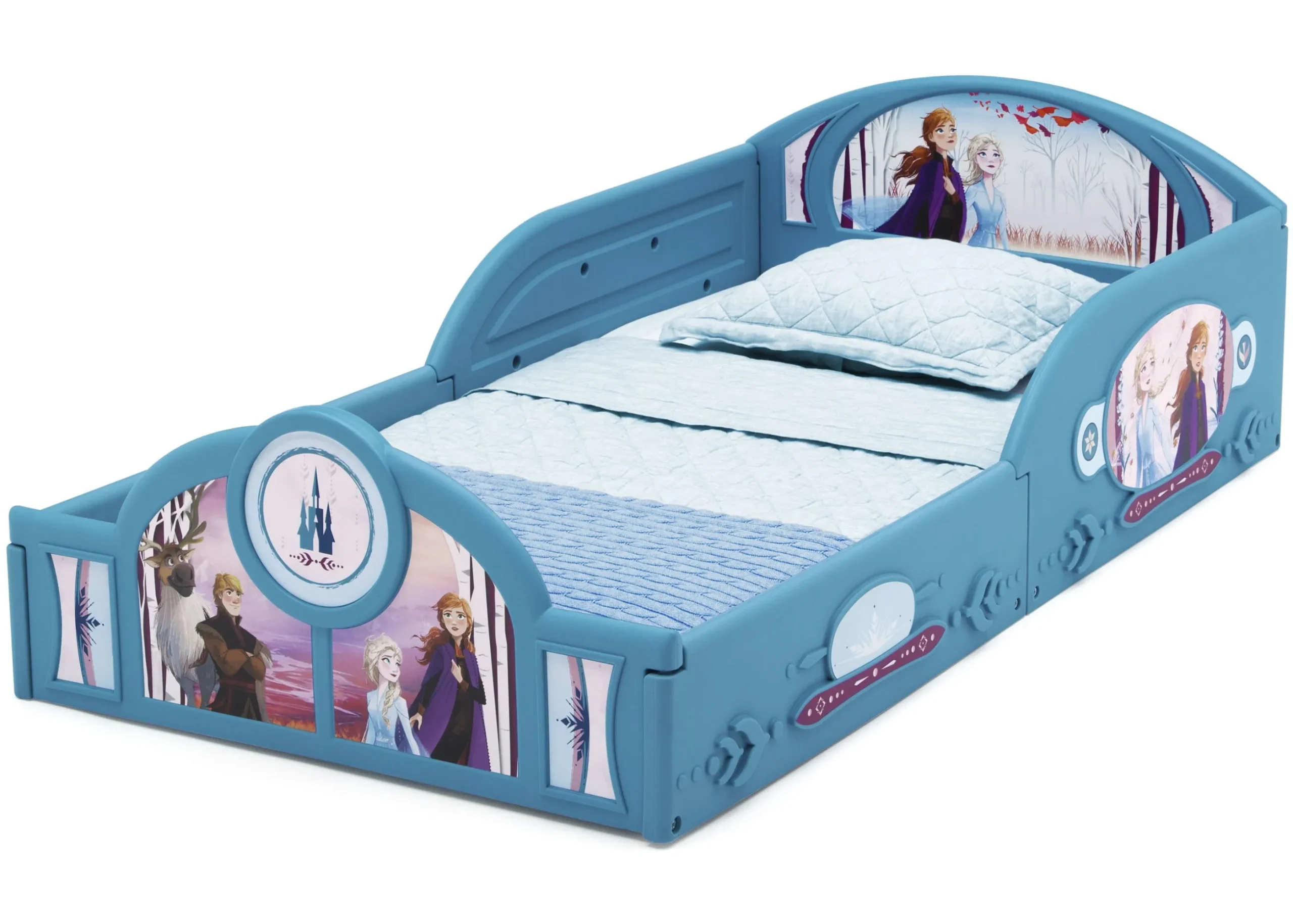 - FROZEN II GRAPHICS AND DESIGN: This toddler bed features bold decals and graphics of Anna, Elsa, Kristoff and Olaf | 3D detailing | Makes it fun and easy for your little one to transition from crib to toddler bed