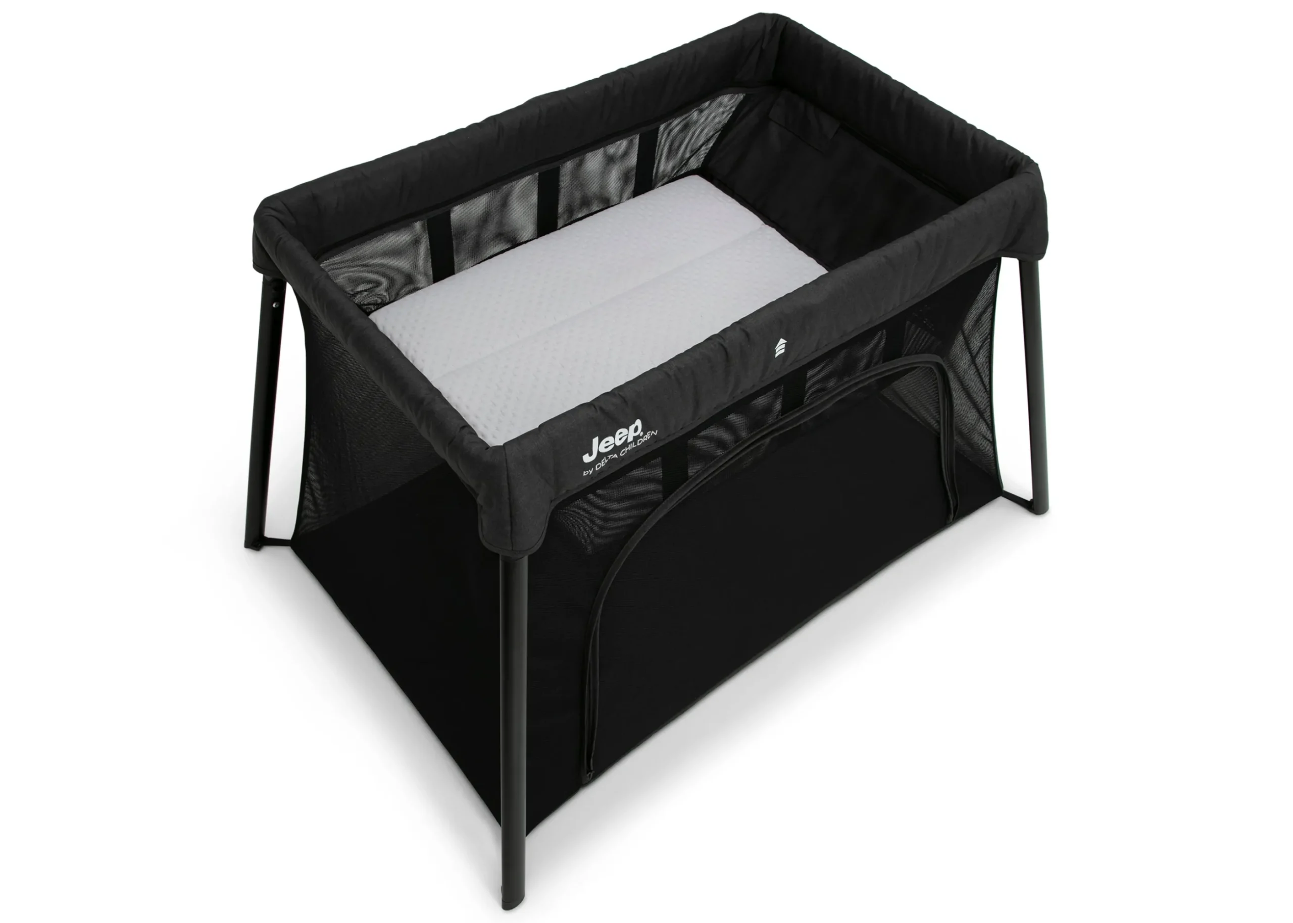 Whether you’re flying, driving, or staying at home, the Jeep Horizon Compact Travel 2-in-1 Play Yard and Bassinet by Delta Children is your portable nursery solution. This portable play yard with a removable bassinet insert offers peace of mind, providing a secure and cozy space for your baby to play and sleep. The water-resistant play area keeps your child in a safe, nearby space whether at home or on the go. Airy mesh netting on all sides allows for maximum ventilation and provides a clear view. An easy-to-open front zipper door provides quick and easy access to your baby. Outfitted with a compact fold, this airport-friendly play yard includes a carry bag that makes travel and storage easy.