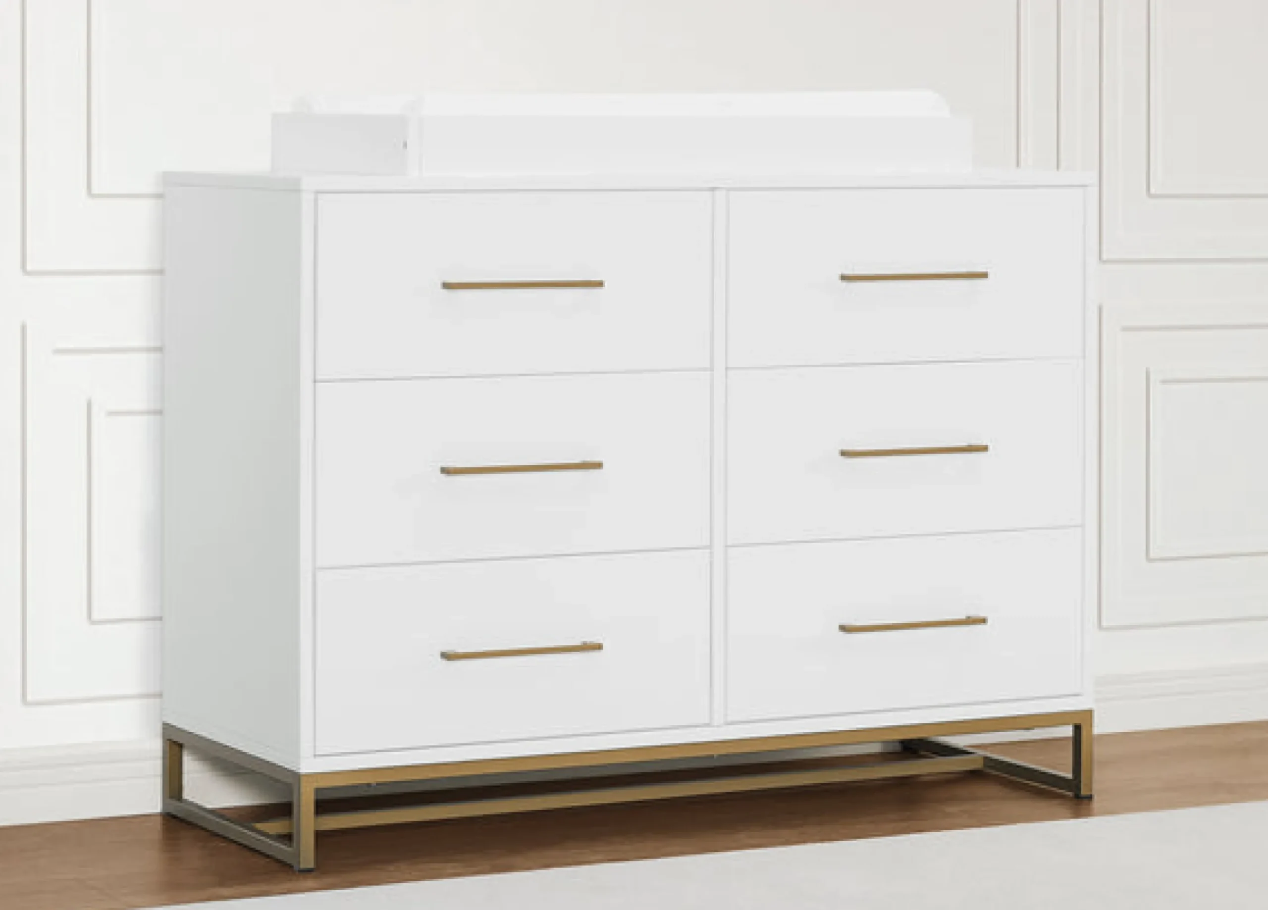 The Jade 6 Drawer Dresser with Interlock Drawer System by Delta Children is the new gold standard for modern nurseries or bedrooms. A standout piece for years to come, this spacious dresser features melted bronze hardware and base for a sleek, stylish look. For your child’s safety, this dresser is outfitted with an interlocking drawer system that limits the number of drawers that can be opened at one time. The Jade 6 Drawer Dresser with Interlock Drawer System by Delta Children is available in Black Ebony and Bianca White. To complete the look, pair this dresser with other items in the Jade Collection by Delta Children. This dresser is tested to meet the current requirements of ASTM F2057, the mandatory CPSC safety standard that protects young children from furniture tip-over incidents. For your children’s safety, only purchase dressers that comply with this standard. For additional security, Delta strongly recommends that all dressers in your home be anchored; all Delta dressers include a wall anchor. To learn how to properly secure your dresser, please see the product assembly instructions or visit our website.