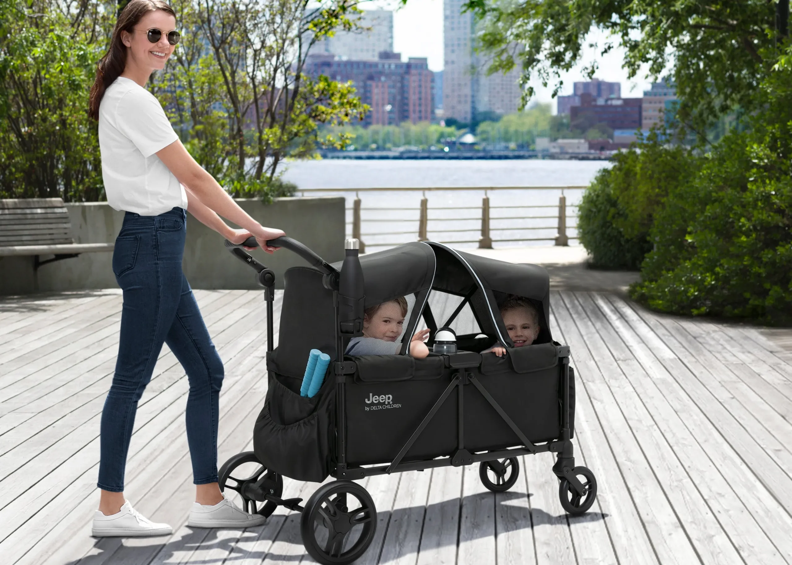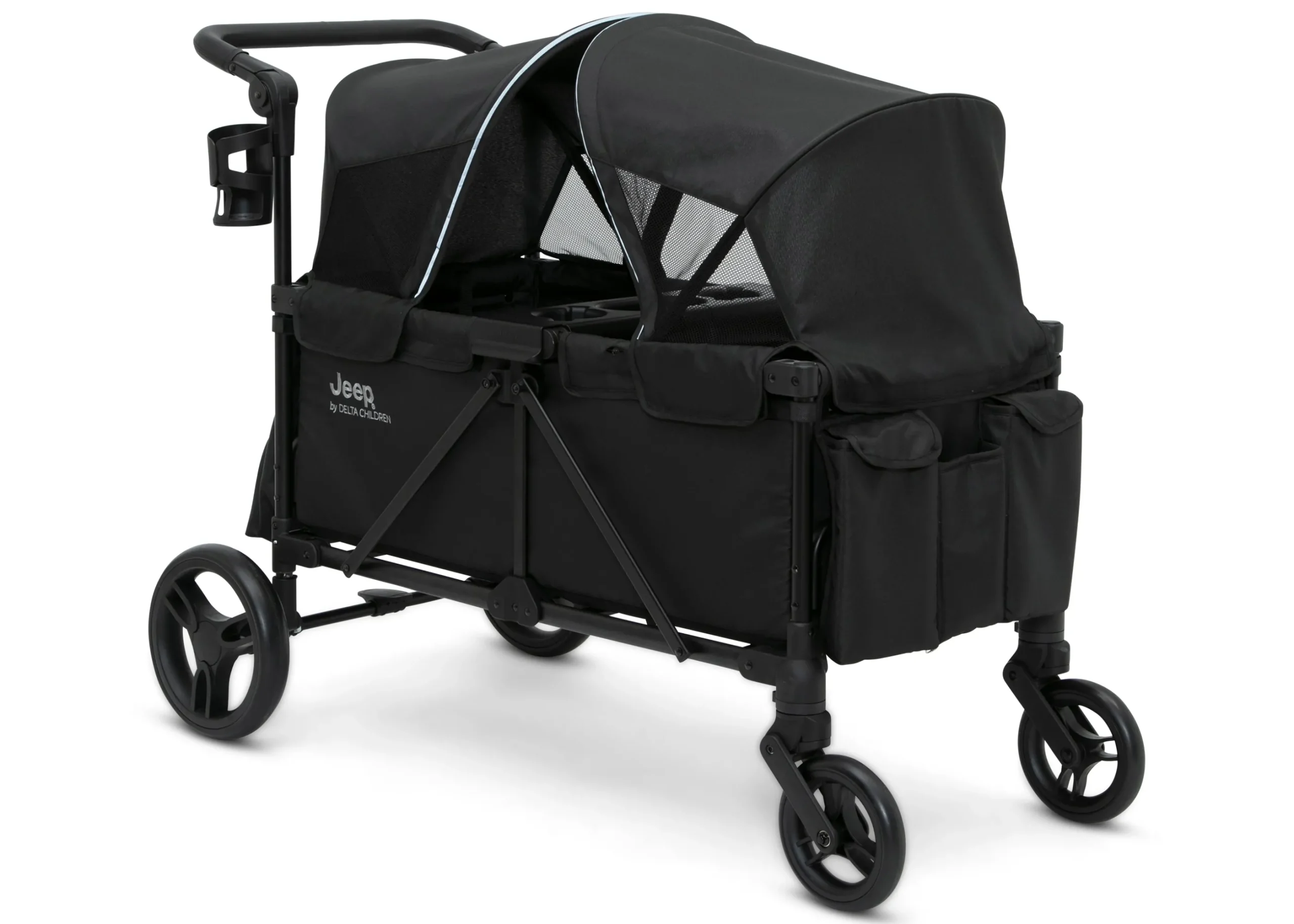 The Jeep Evolve Stroller Wagon by Delta Children will take you here, there and just about everywhere. A comfy option for siblings or friends, this versatile stroller wagon features two adjustable canopies with breathable mesh inserts for sun protection and increased airflow. With two kids safely in tow, the adjustable leatherette handlebar with five different positions gives you the ability to push or pull on your next adventure. Equipped with tons of storage inside and out, each wagon comes with an expandable bag, tons of pockets, parent cupholder and child’s tray with cup holders for snacks and drinks. Built to last, this wagon’s durable rust-resistant frame, puncture-proof tires and compact fold make it easy to stow or transport.More than a stroller wagon the Jeep Evolve Stroller Wagon by Delta Children makes it possible to create your own adventures with your family. Holds up to 100 lbs. (50 lbs. per seat). Weighs 30.5 lbs. Recommended for ages 9 months up to 50 lbs.Fits the following car seats (car seats and car seat adapter #A1970-001 sold separately): Graco SnugRide Click Connect 30, 35, 40 Evenflo Nurture Evenflo Embrace, Britax B-Safe 35, Chicco KeyFit 30.