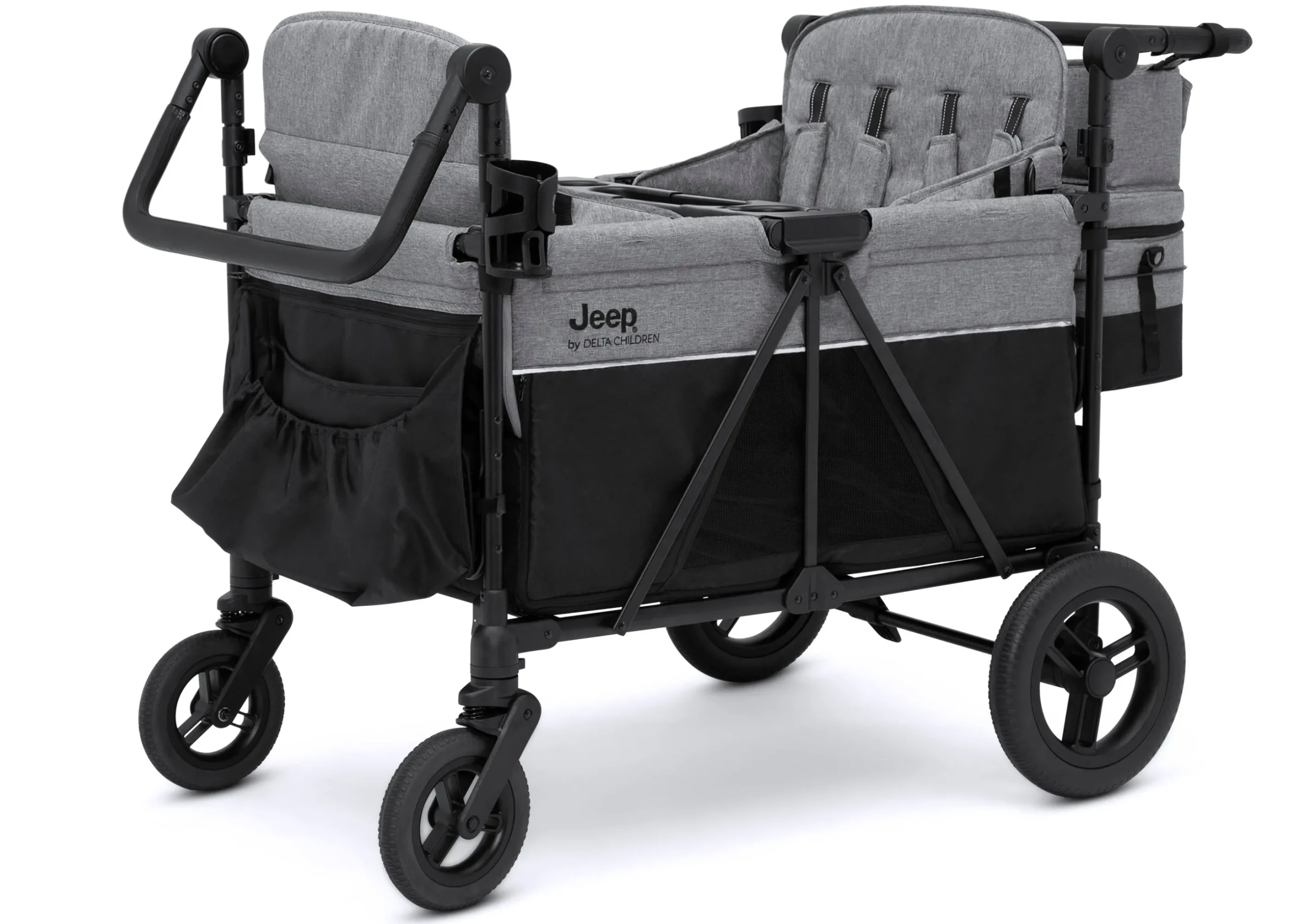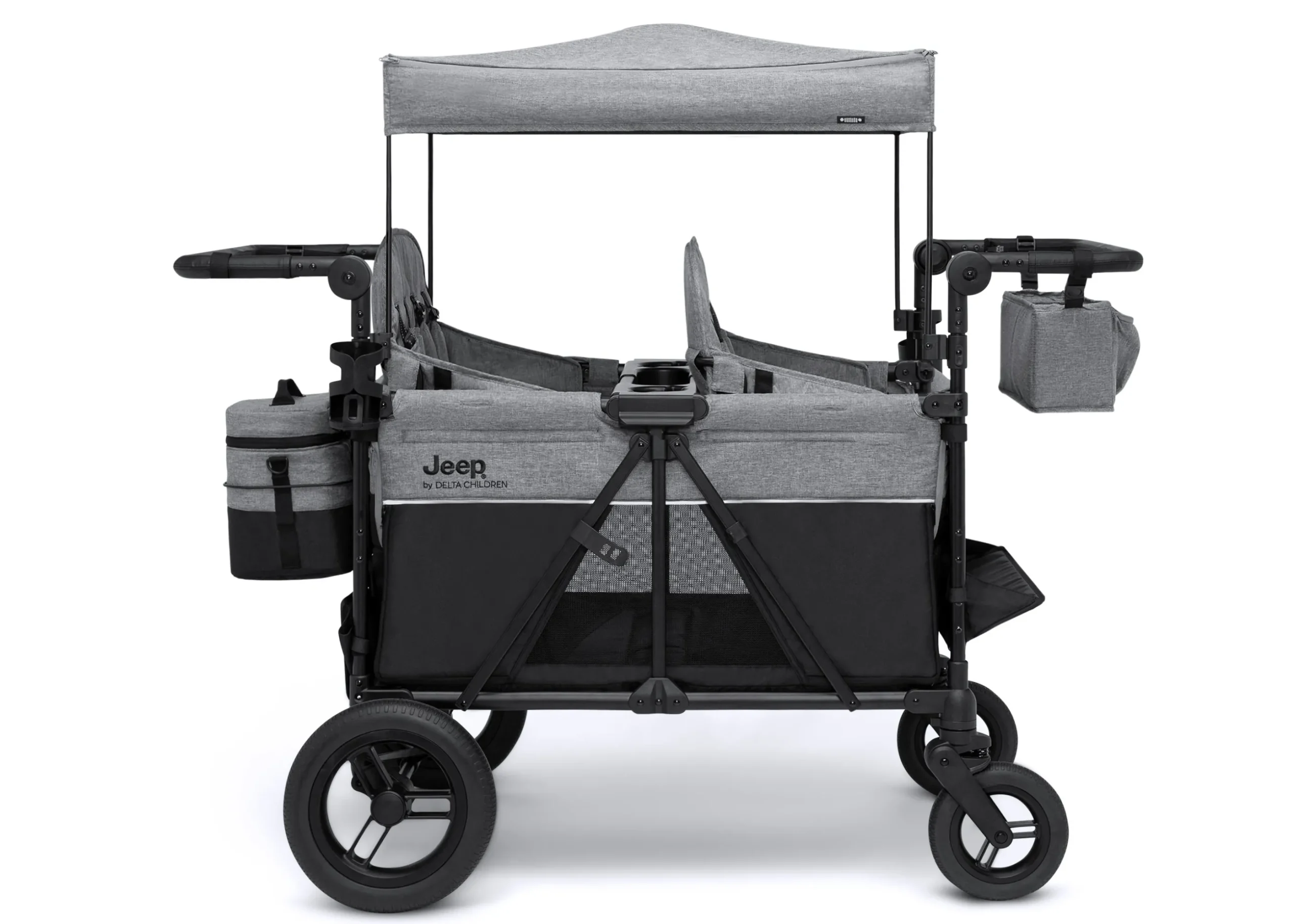 Expand your adventure with the Jeep Wrangler Deluxe 4 Seater Stroller Wagon by Delta Children. Built with everything you love about Jeep Wagons, but with room for four passengers, this XL wagon allows you to bring even more essential cargo and all the people you love along for the journey. A great option for growing families, this first-of-its-kind convertible wagon offers a range of seating options to accommodate up to four children—both seats can face forward, both can face backwards, both can face inwards, both can face out in different directions, or you can remove the seats completely and use the wagon to carry all your gear. Outfitted with a multitude of convenient features to help accommodate and entertain your larger crew, this wagon comes with a removable canopy that has roll down mesh screens for ventilation or black out privacy screens for on-the-go naps. Take advantage of the wagon’s expansive storage. The wagon features front and rear storage pockets, a large cooler that can be attached to the front, back or side of the wagon, zippered storage compartments under the seats, kids snack tray, plus two parent cup holders. Two adjustable leatherette handlebars ensure a comfortable grip for parents of all heights, while the large, puncture-proof tires provide a smooth ride on any terrain. The wagon’s flat fold makes it easy to store and transport. It’s the perfect all-in-one solution for growing families.