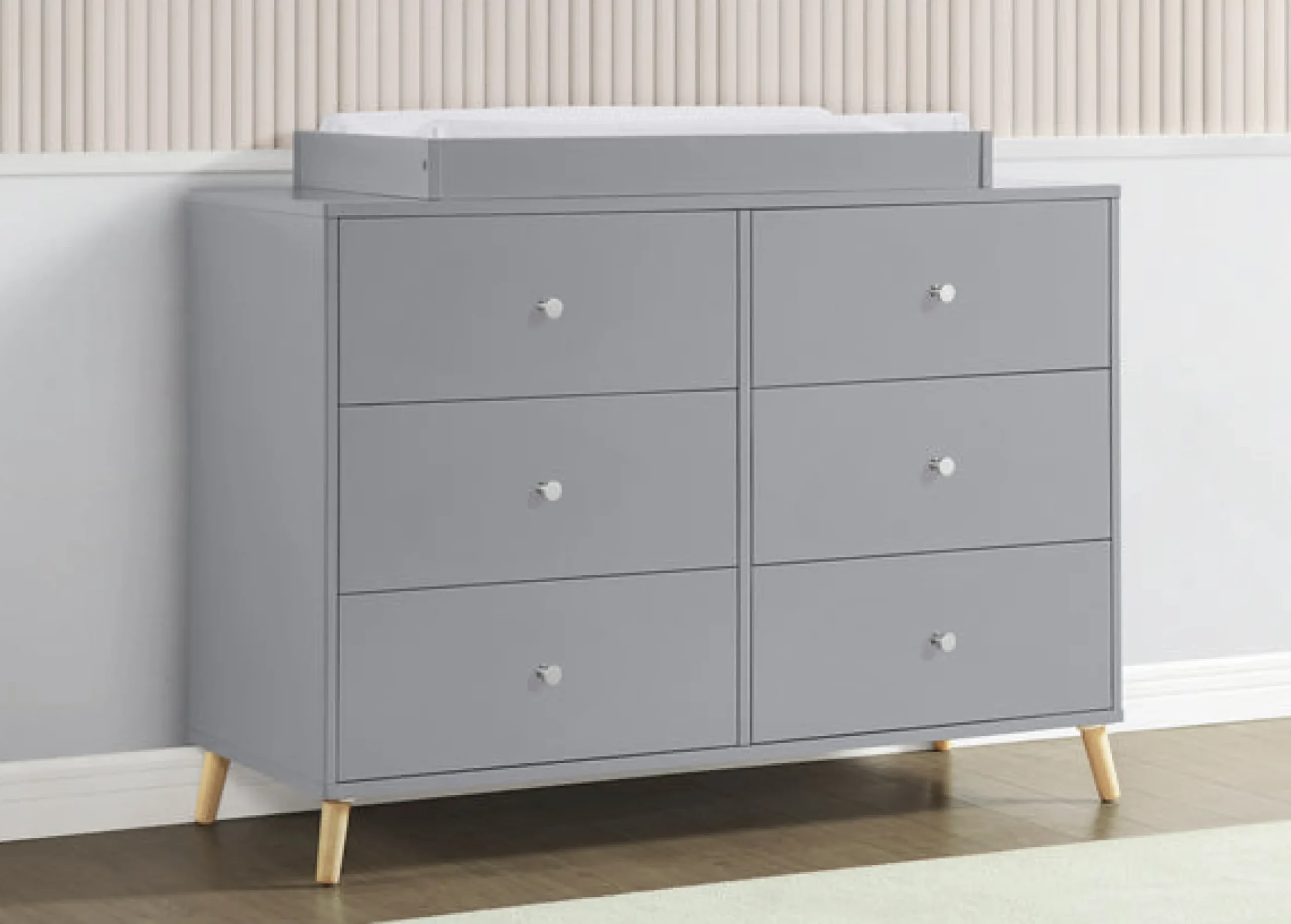 The Jordan 6 Drawer Dresser by Delta Children is a must-have storage unit for stylish parents and kids! Designed to elevate modern nurseries or bedrooms, it’s the perfect accompaniment to your Jordan Crib with its matching splayed feet. With six spacious drawers, this sturdy dresser provides a range of practical storage possibilities to suit all of your needs. Use it alone or attach the coordinating Changing Top #W100810 to create a secure and stylish changing table (Changing Top sold separately). For your child’s safety, this dresser is outfitted with an interlocking drawer system that limits the number of drawers that can be opened at one time. All Delta Children dressers and chests meet the requirements of ASTM F2057, the voluntary industry tip over standard for dressers. For your children’s safety, only purchase dressers that comply with this standard. For additional security, Delta strongly recommends that all dressers in your home be anchored; all Delta dressers include a wall anchor. To learn how to properly secure your dresser, please see the product assembly instructions or visit our website.