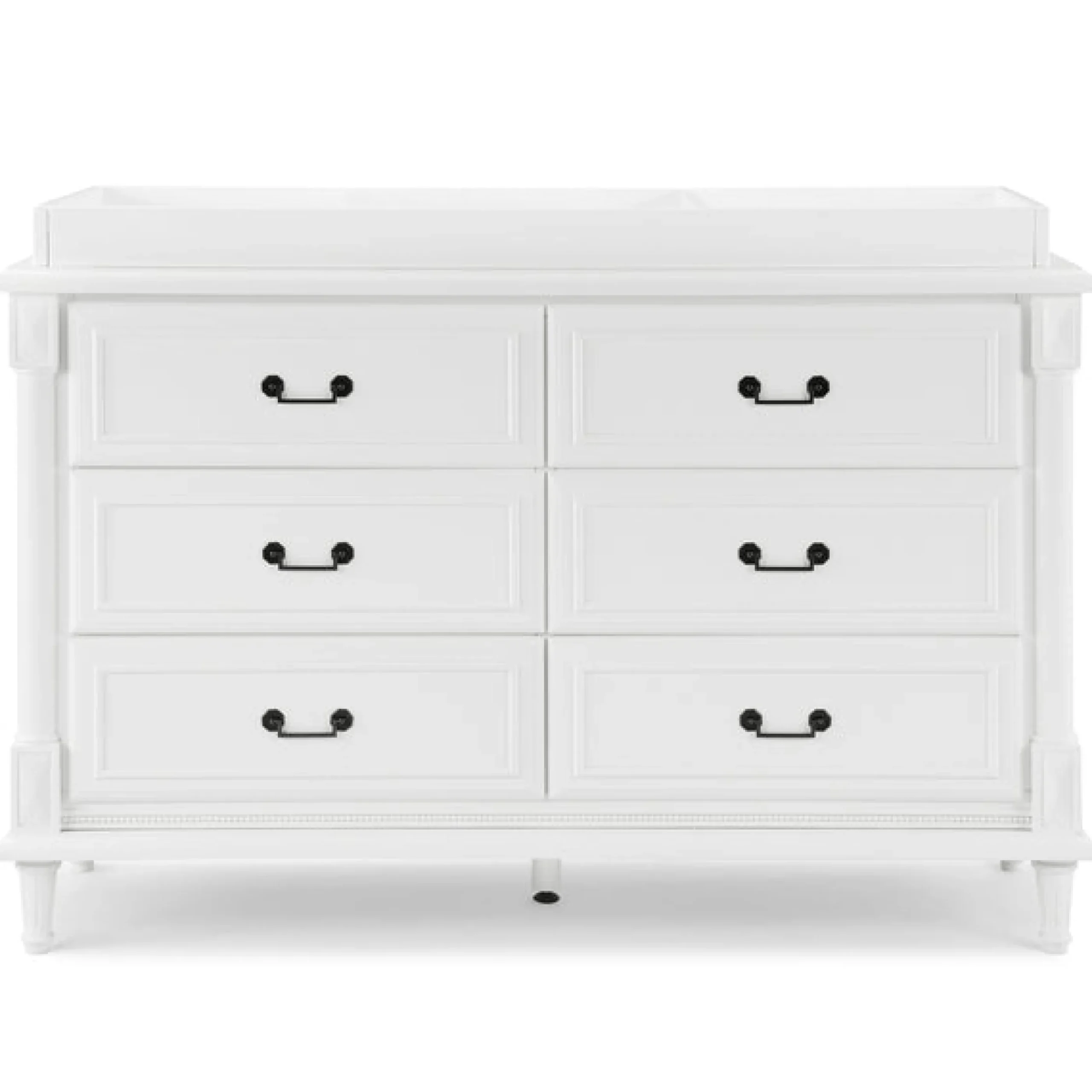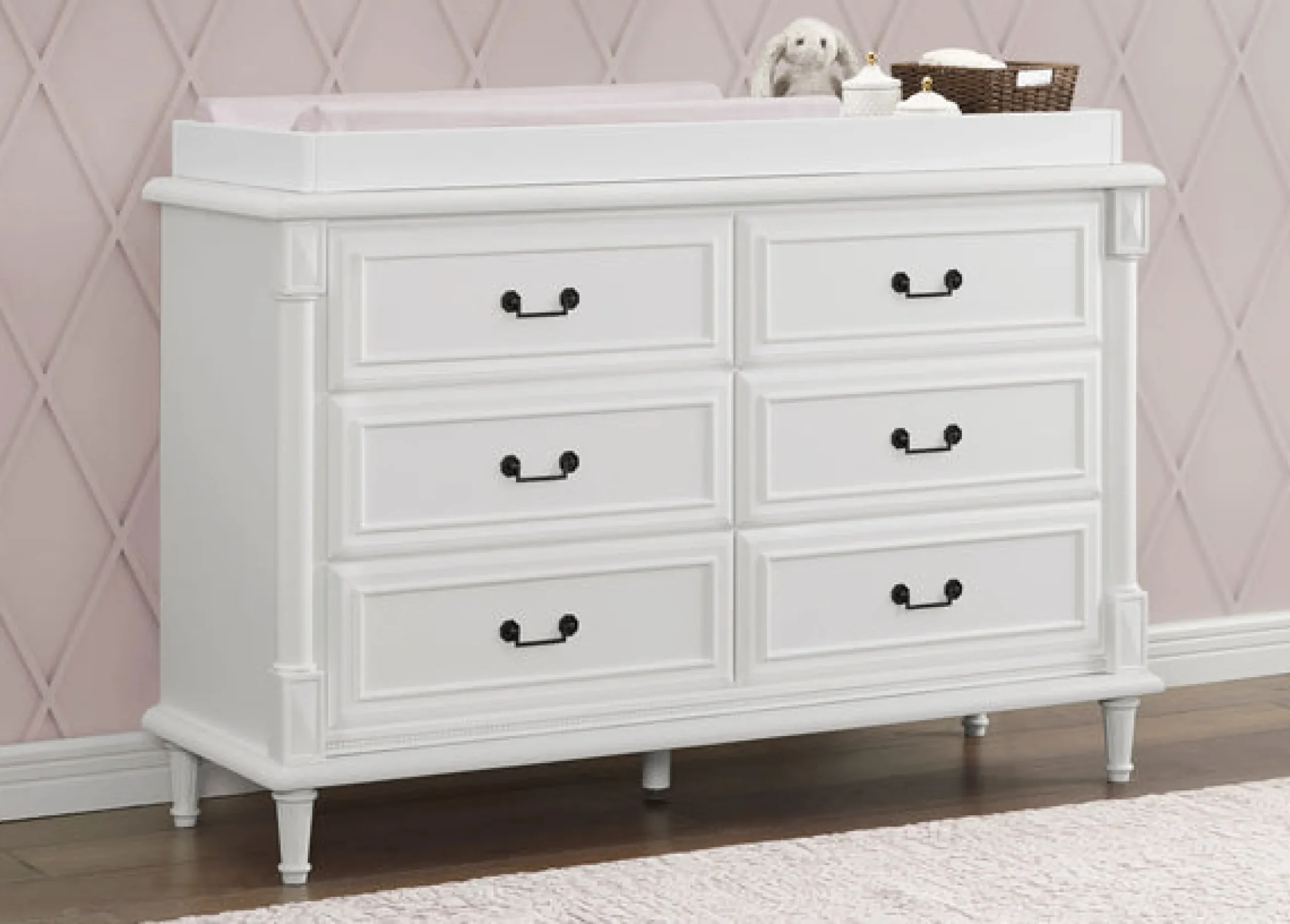 The Juliette 6 Drawer Dresser with Changing Top and Interlocking Drawers by Simmons Kids is an elegant and functional addition to the nursery, kids’ bedroom, even your master bedroom. The timelessness of this dresser is found in the details—the elegant molding on drawer fronts, fluted legs with intricate carvings and antique brass drawer pulls elevate any bedroom. It features six spacious drawers for ample clothing storage and includes a removable changing top that creates the perfect space for diaper changing. Remove the changing top to create a more grown-up space later on. For your child’s safety, this dresser is outfitted with an interlocking drawer system that limits the number of drawers that can be opened at one time. Plus, it’s GREENGUARD Gold Certified, which means it’s built to contribute to cleaner air for a healthy home. To complete your nursery, pair with the coordinating Juliette 6-in-1 Convertible Crib by Simmons Kids.This Simmons Kids dresser is tested to meet the current requirements of ASTM F2057, the mandatory CPSC safety standard that protects young children from furniture tip-over incidents. For your children’s safety, only purchase dressers that comply with this standard. For additional security, Simmons Kids strongly recommends that all dressers in your home be anchored; all Simmons Kids dressers include a wall anchor. To learn how to properly secure your dresser, please see the product assembly instructions or visit our website.