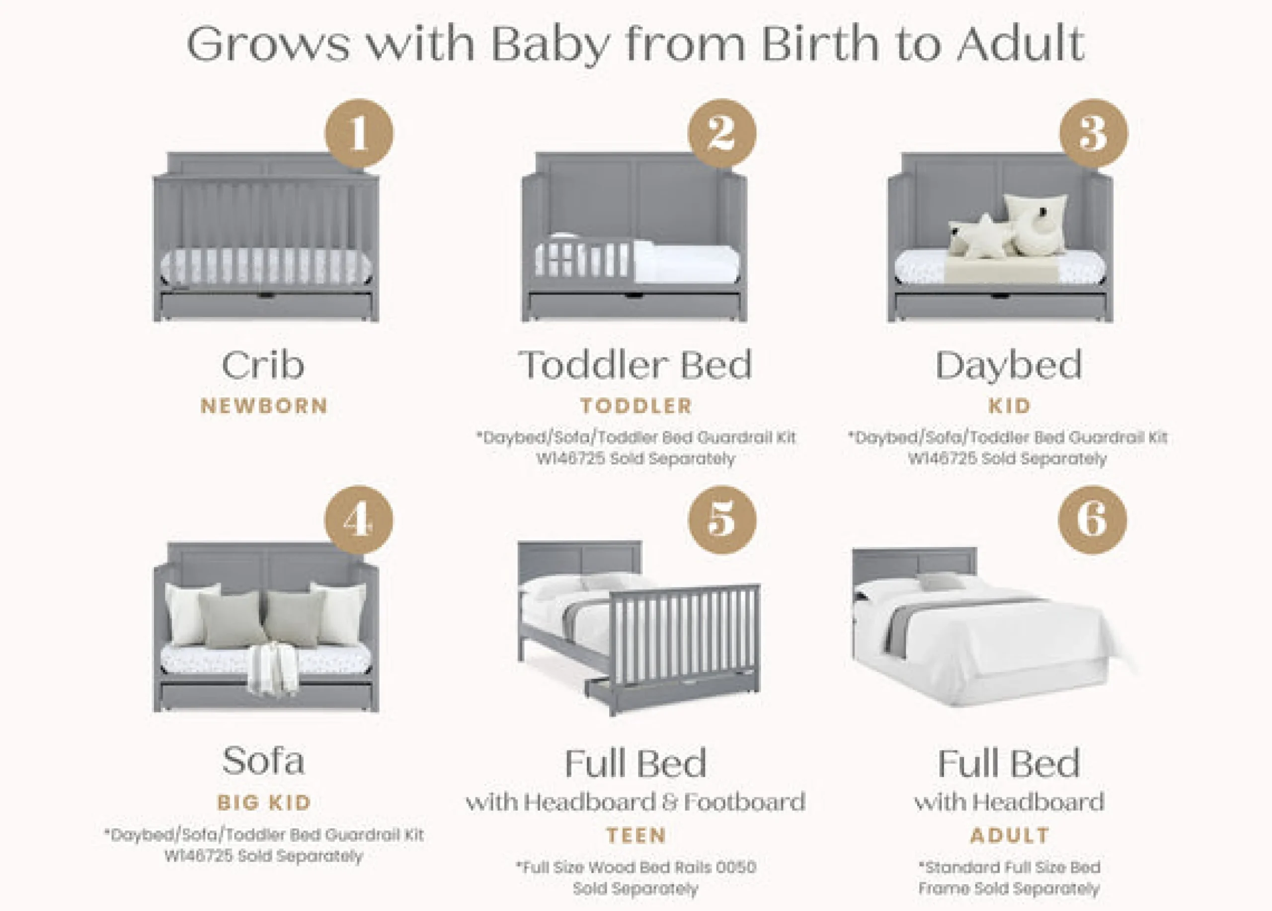 This crib’s grow-with-me design effortlessly converts to a toddler bed, sofa, daybed and full size bed with headboard and footboard or headboard only (Daybed/Sofa/Toddler Guardrail W146725 and Full Size Wood Bed Rails 0050 sold separately)