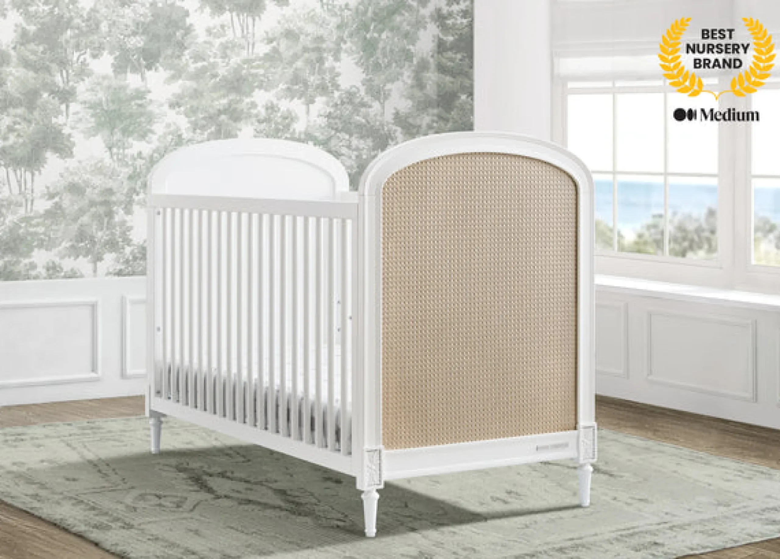 This stunning crib features woven cane detailing on both end panels that contrasts beautifully with the solid wood frame, while rosette carvings and fluted legs elevate the design