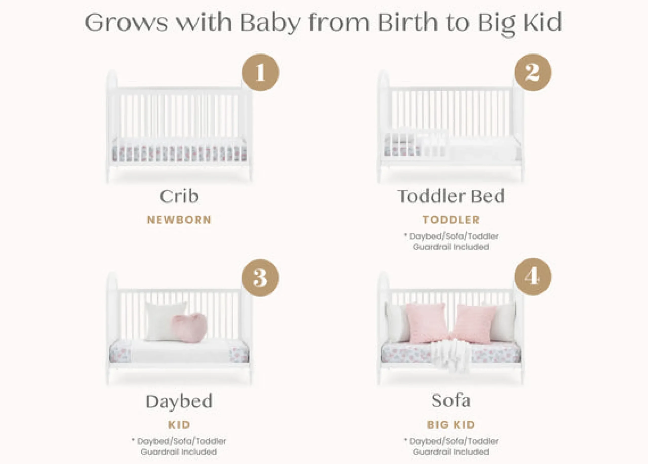 The Madeline 4-in-1 Convertible Crib converts to a toddler bed, daybed and sofa (Daybed/Sofa/Toddler Guardrail included)