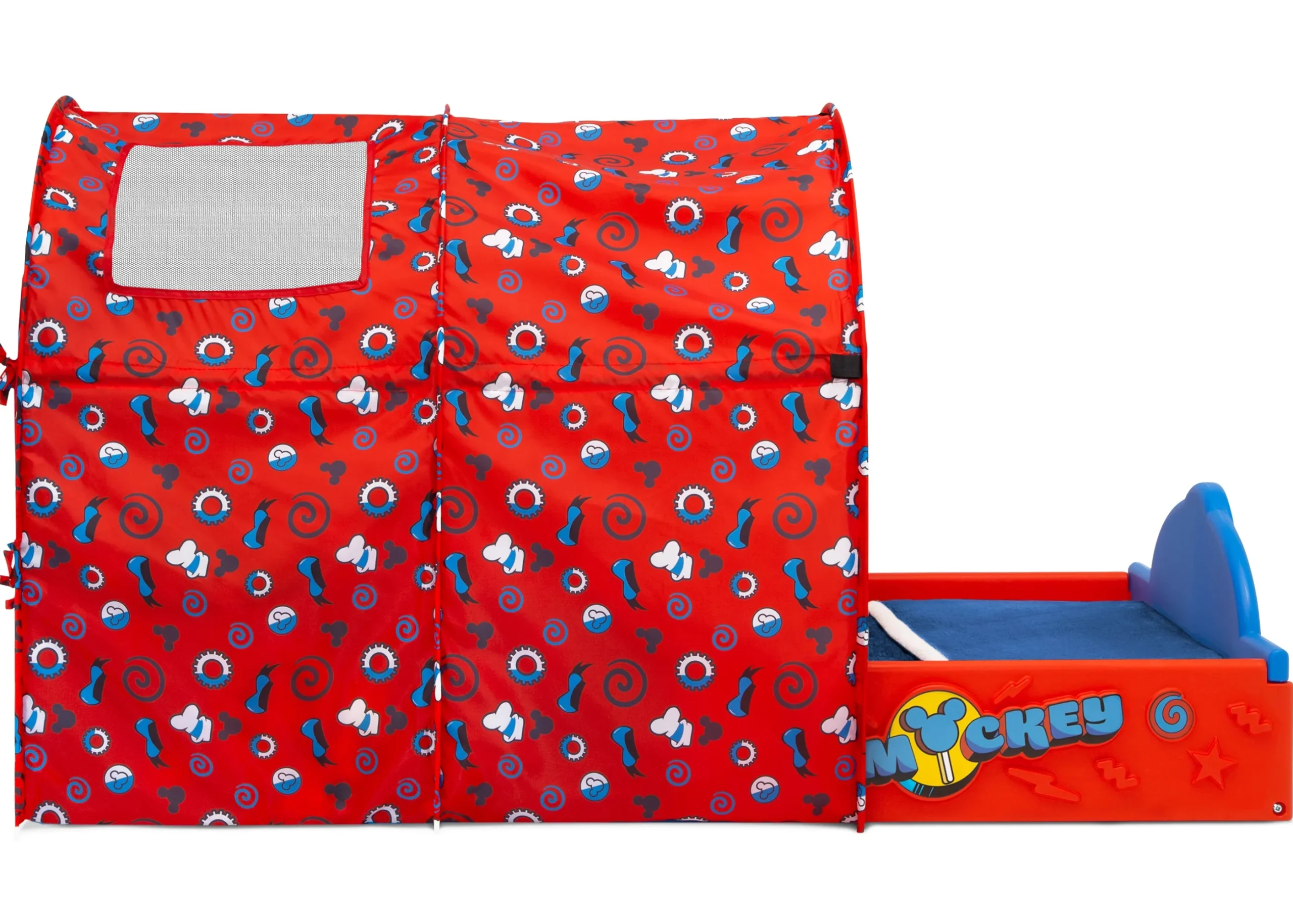 - This toddler tent bed features a fun, fabric tent with mesh windows and bold graphics of Mickey Mouse