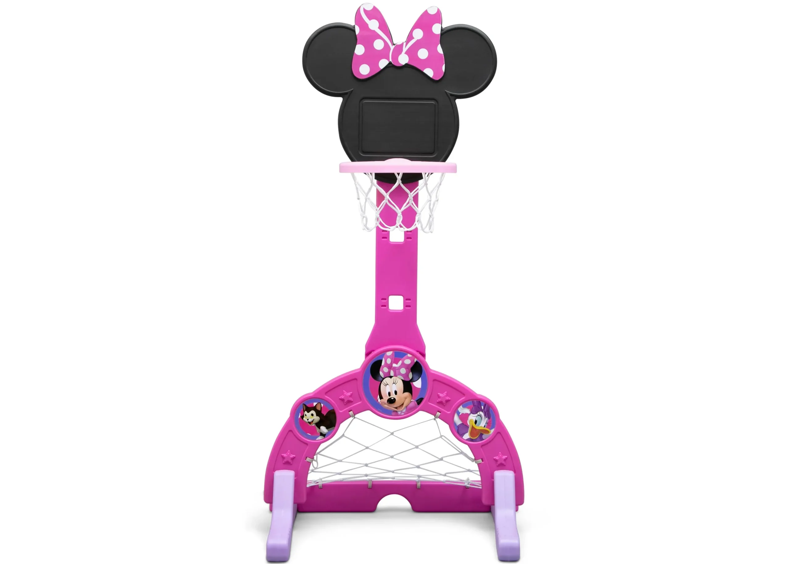 Game on! Tiny sports fans will love this Minnie Mouse 4-in-1 Sports Center by Delta Children. Designed to keep your little one active and entertained, this activity center features a basketball hoop, soccer/hockey net and golf game (basketball, soccer ball, two golf/hockey clubs and four golf/hockey balls included). It will also help develop social, motor skills and coordination as kids run, kick and score. The height can be adjusted between 40.35 inches and 51.38 inches to accommodate all ages and skill levels. Use inside or outside. Before play, add sand or water to the base for stability.