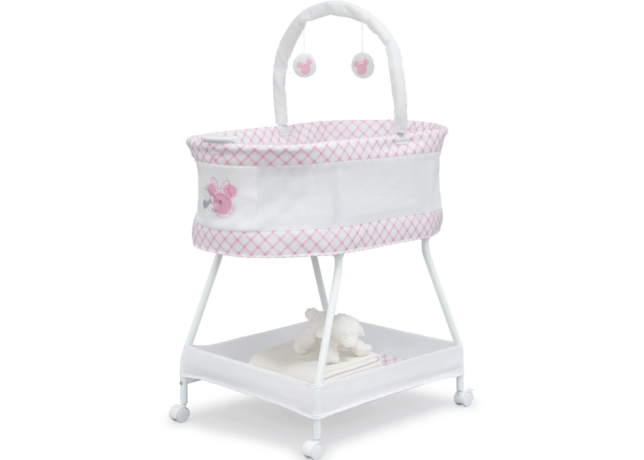 Designed to help your little one fall asleep faster and stay asleep, the Disney Minnie Mouse Sweet Dreams Bassinet by Delta Children is a dream come true. This must-have bassinet features a control panel at the front with vibration, nightlight and soothing sounds to lull your newborn to sleep while mesh sides provide open airflow for breathability and a clear view of your baby. For your convenience, the removable toy bar provides entertainment if your baby wakes, lockable wheels make it easy to move around the house, and the easy-to-reach storage basket keeps changing essentials within reach. The Disney Minnie Mouse Sweet Dreams Bassinet is the easiest way stay safely connected and close to your baby during their first few months. This bassinet is recommended for babies 0-5 months or up to 30lbs. Stop use at 5 months or once your infant begins to push up on their hands and knees, whichever comes first.