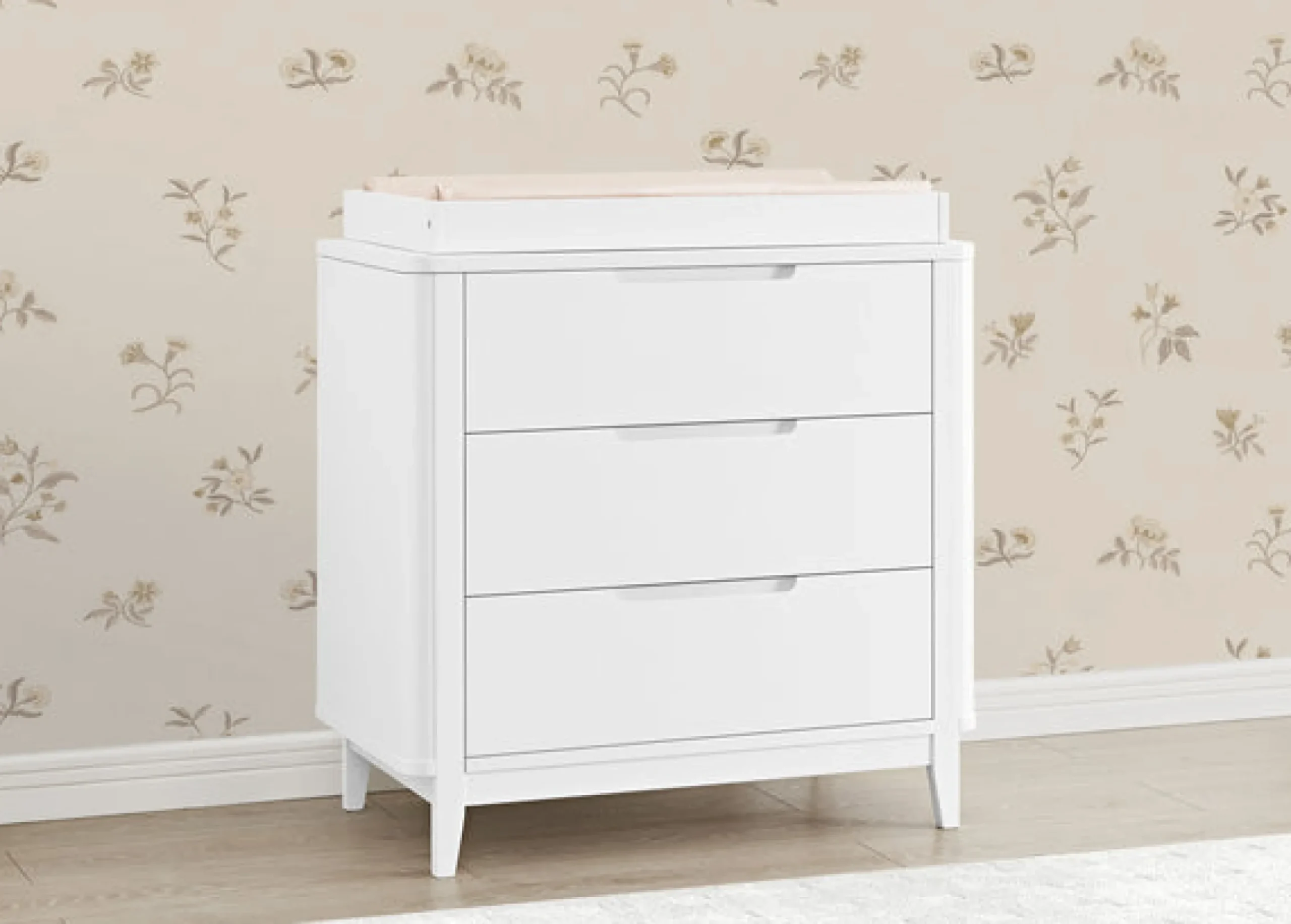 The Noah 3 Drawer Dresser with Changing Top by Delta Children features three spacious drawers with cutout handles, rounded corners and tapered feet for a streamlined, modern look