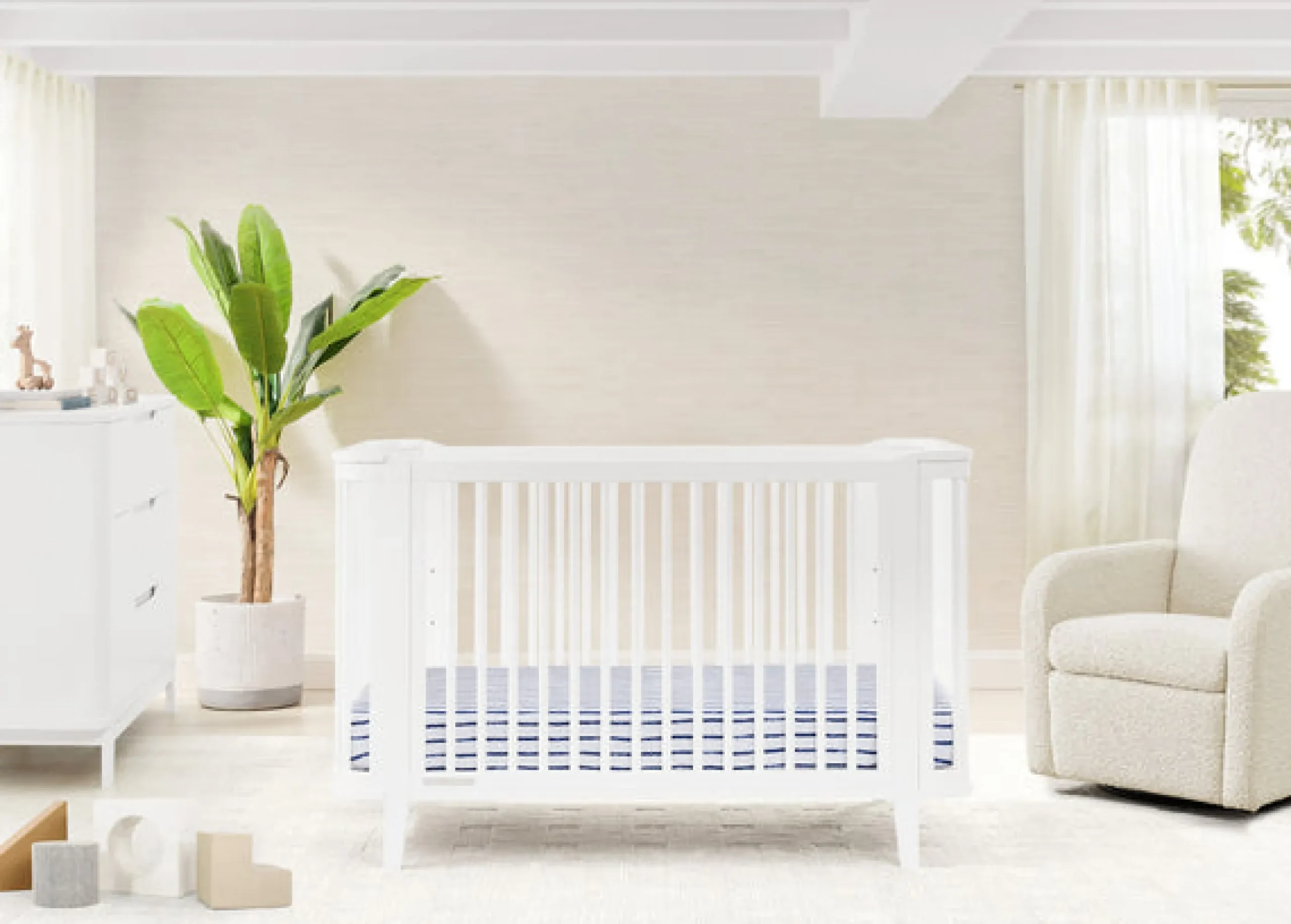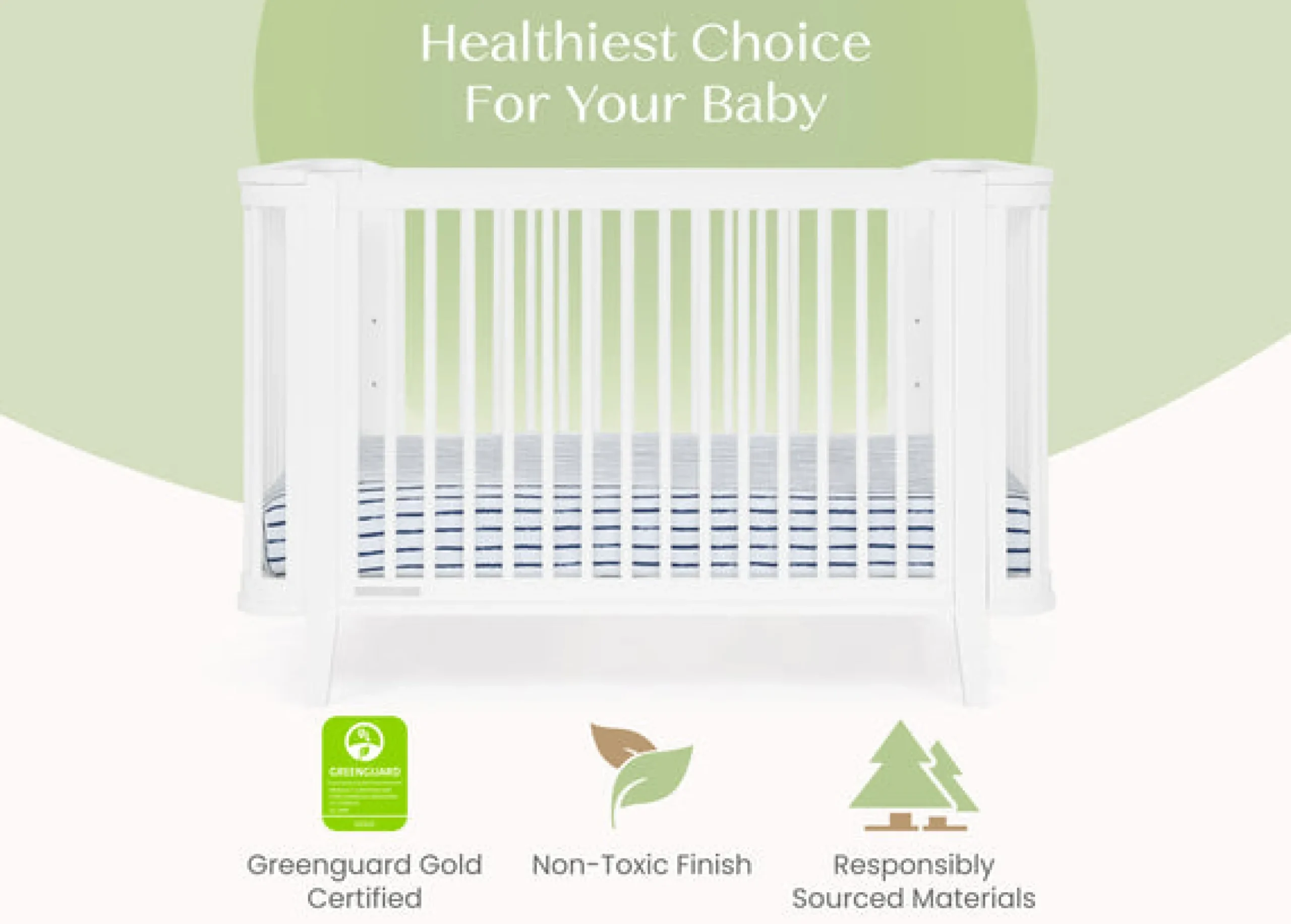 This crib meets or exceeds the most stringent chemical emissions standards to create a healthier home for your baby. It has been screened for more than 10,000 chemicals and VOCs that are known to pollute indoor air, certifying it contributes to cleaner indoor air. When you buy this crib, you can feel good about what you’re putting in your child’s nursery