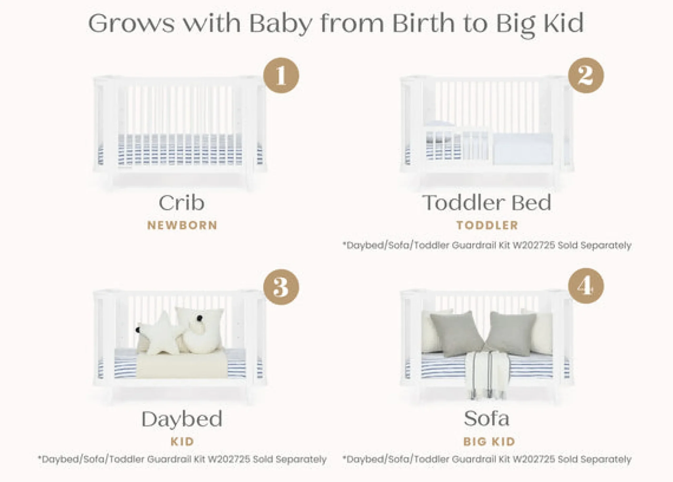 - Crib converts to a toddler bed, daybed and sofa (Daybed/Sofa/Toddler Guardrail #W202725 sold separately)