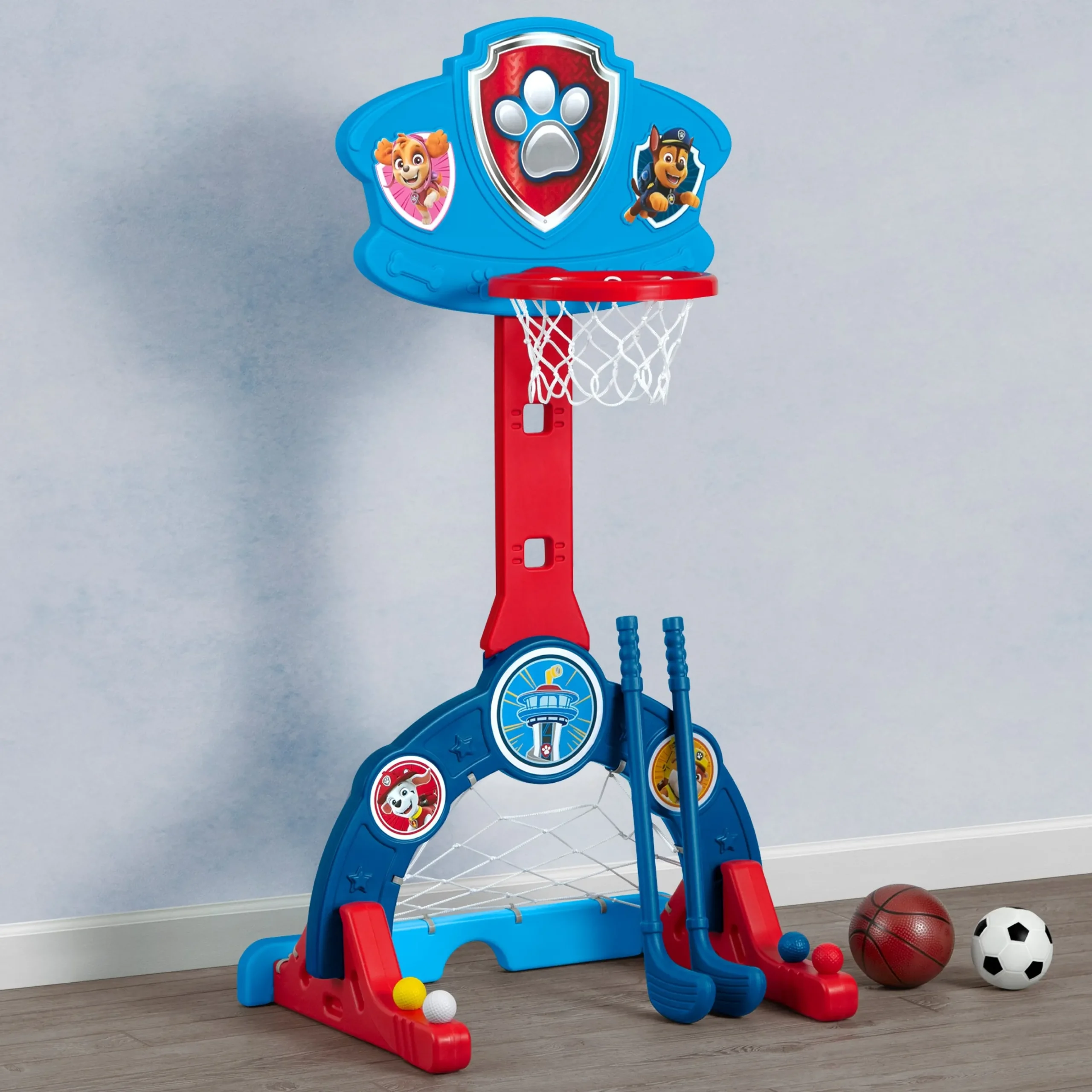 Game on! Tiny sports fans will love this PAW Patrol 4-in-1 Sports Center by Delta Children. Designed to keep your little one active and entertained, this activity center features a basketball hoop, soccer/hockey net and golf game (basketball, soccer ball, two golf/hockey clubs and four golf/hockey balls included). It will also help develop social, motor skills and coordination as kids run, kick and score. The height can be adjusted between 40.35 inches and 51.38 inches to accommodate all ages and skill levels. Use inside or outside. Before play, add sand or water to the base for stability.