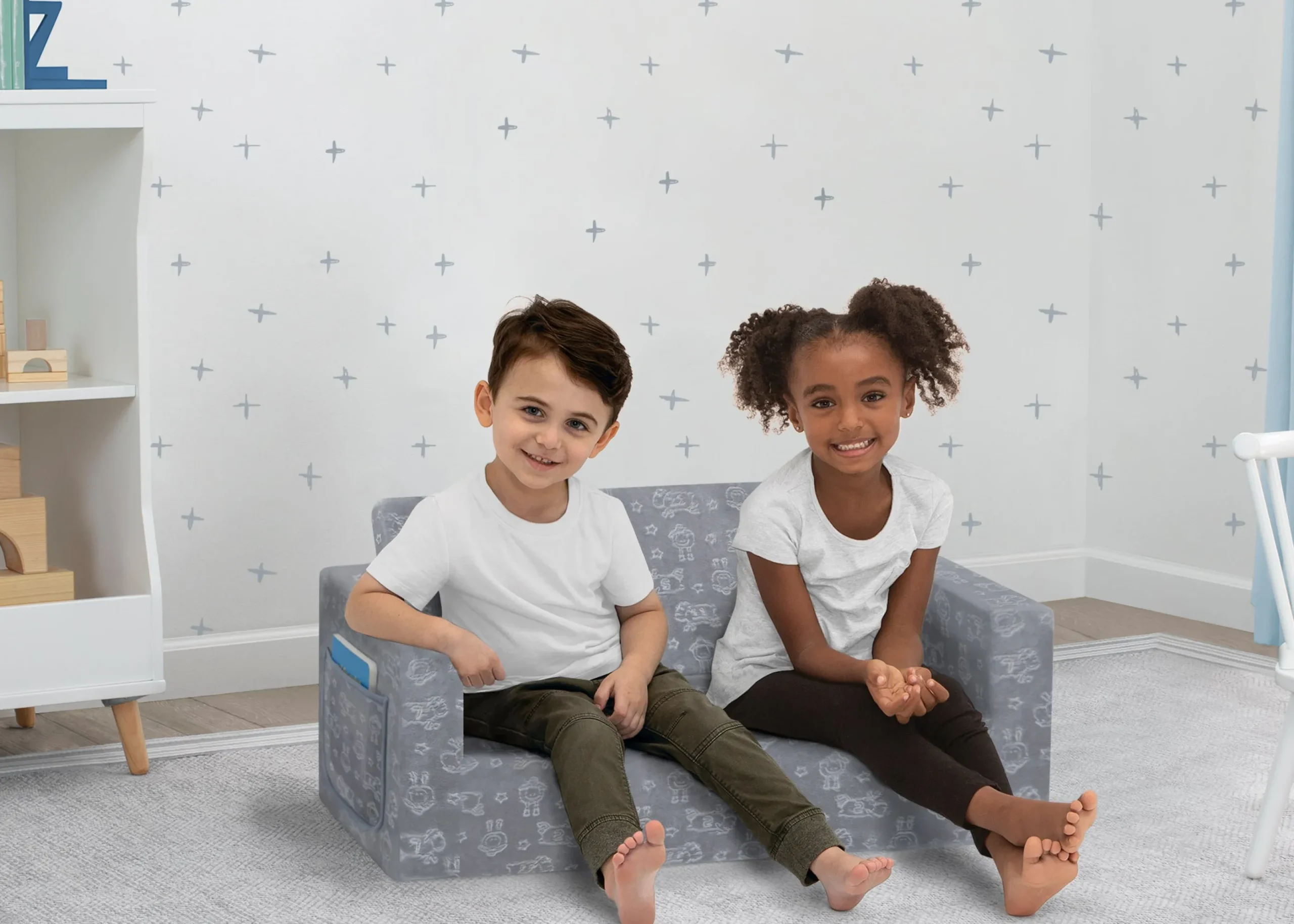 The Serta Perfect Sleeper Extra Wide Convertible Sofa to Lounger is a cozy chair by day, laid-back lounger by night. This convertible seat easily flips open to reveal multiple ways for your child to relax–they’ll love to sit and read or watch their favorite movies on the chair but when it’s time for a nap, this seat folds out into a comfy sleeper bed. Big enough to fit three small kids comfortably in sofa mode, it’s light enough to move around the house and is ideal for your children to share during playtime or sleepovers. The super-soft slipcover embossed with an adorable Serta sheep pattern features an easy-to-reach side pocket where your little one can keep their favorite books or tablet. The supportive foam construction will keep its shape and provides all-day comfort. Plus, the chair’s non-slip bottom ensures it stays in place. Designed to ship in a super-small box, this lightweight foam kids’ sofa and lounger may take up to 24 hours to fully expand once unboxed. Machine-washable slipcover zips off for easy cleaning. Recommended for ages 18 months+.