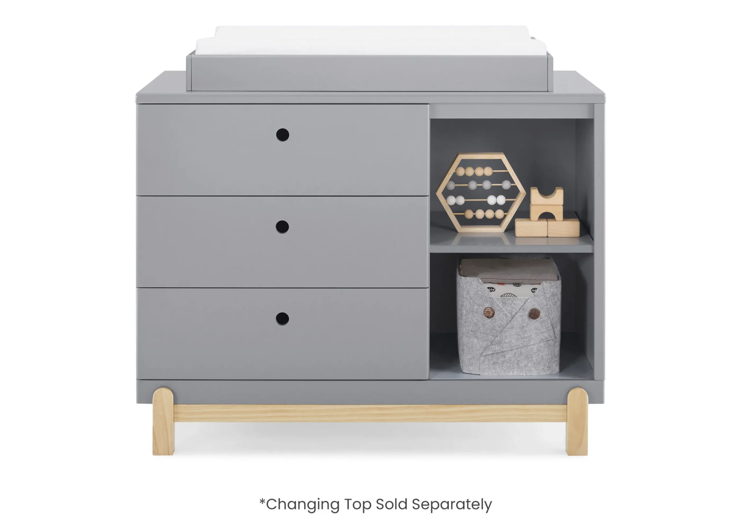 Modern and playful, this versatile dresser features a natural wood base and feet paired with a contrasting finish on top for a look that works from baby to big-kid. Circle cutout handles are easy to grasp