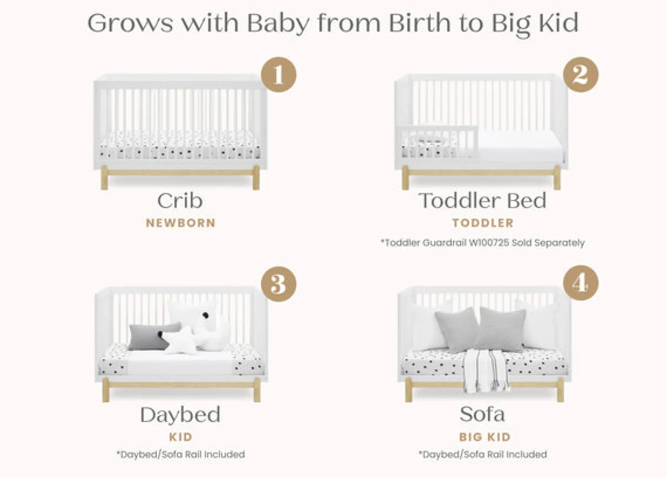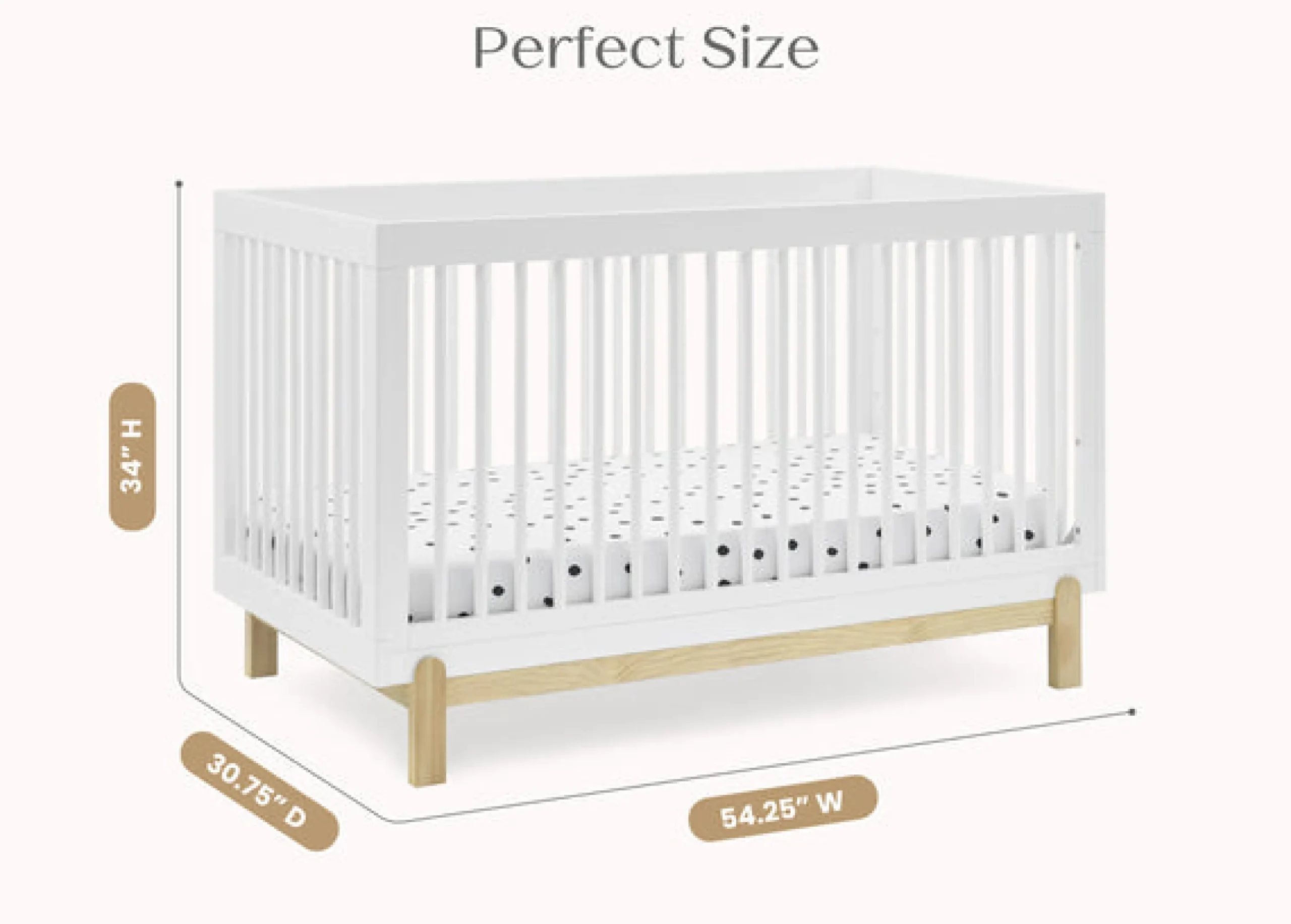The stylish two-toned Poppy 4-in-1 Convertible Baby Crib by Delta Children will be the centerpiece of your little one’s bedroom for years to come. It’s a timeless, modern crib that features an adjustable height mattress, plus it converts into a toddler bed, daybed and sofa as your child grows (Daybed/Sofa Rail included; Toddler Guardrail #W100725 sold separately). The warm, natural wood tone of this crib’s base and feet is paired with contrasting round spindles to create a modern, sleek style that adapts to all your child’s sleep needs from baby to big-kid. To complete your nursery, pair the Poppy 4-in-1 Convertible Crib with the Poppy 3 Drawer Dresser with Cubbies by Delta Children. Crib is available in Bianca White with Natural, Grey with Natural and Midnight Grey with Natural. Crib mattress not included.