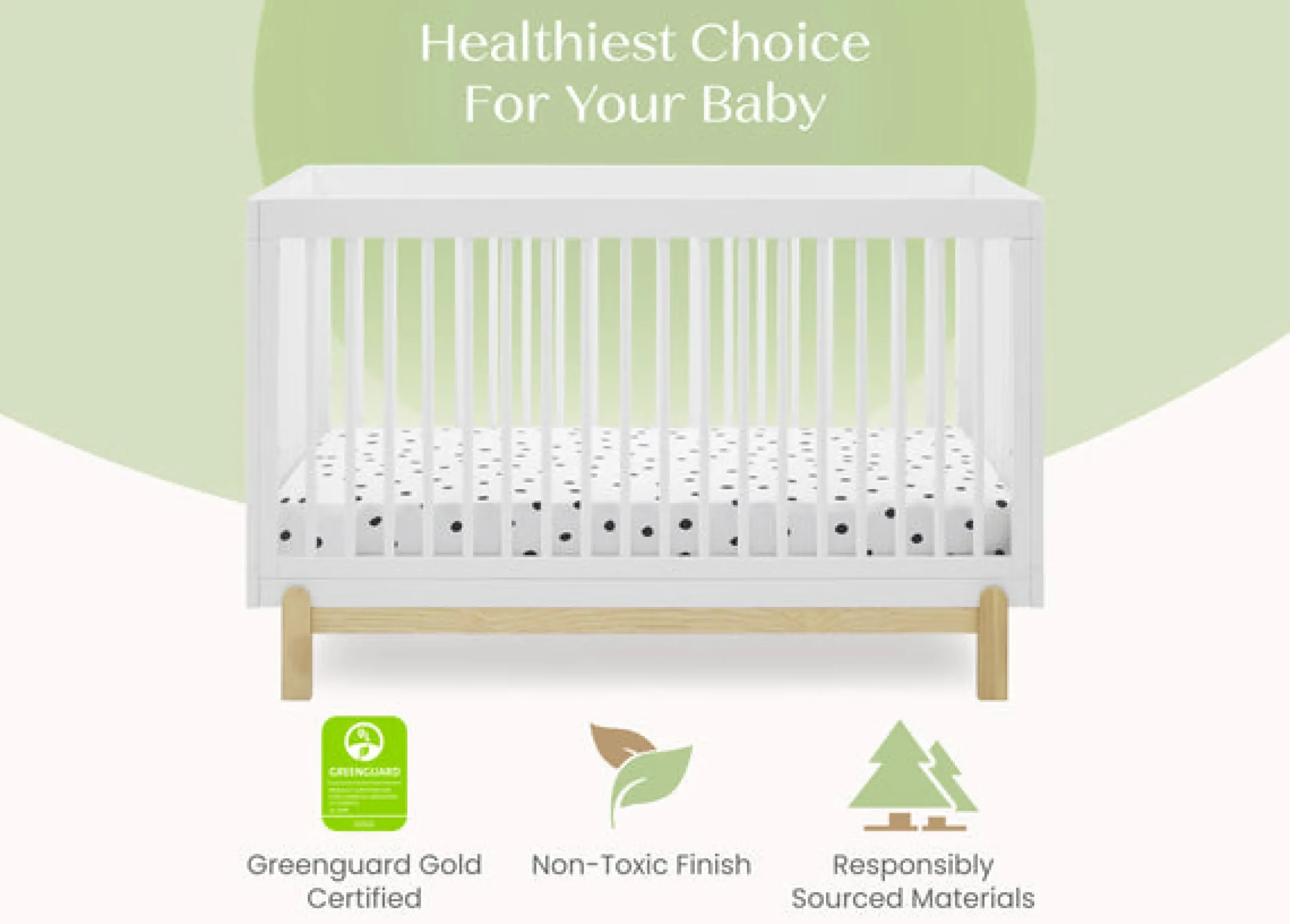 This crib meets or exceeds the most stringent chemical emissions standards to create a healthier home for your baby. It has been screened for more than 10,000 chemicals and VOCs that are known to pollute indoor air, certifying it contributes to cleaner indoor air. When you buy this crib, you can feel good about what you’re putting in your child’s nursery