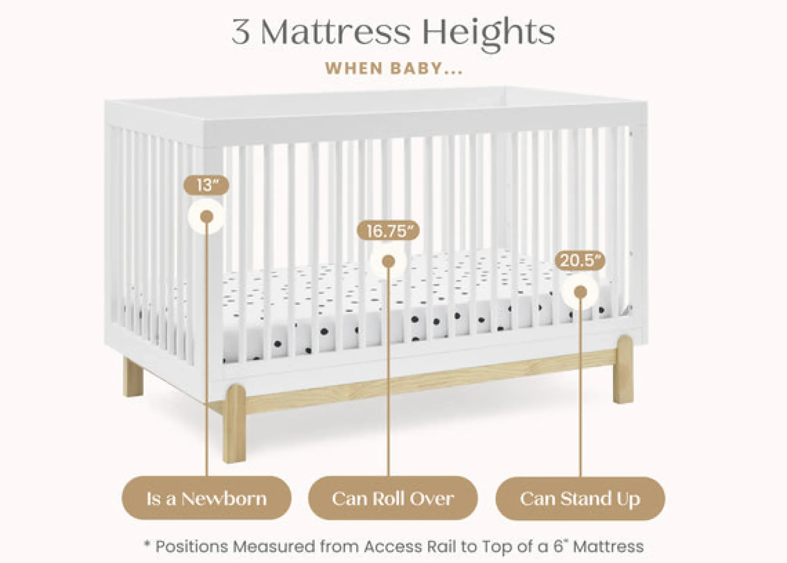 - Adjustable height mattress support with 3 convenient positions to grow with your baby