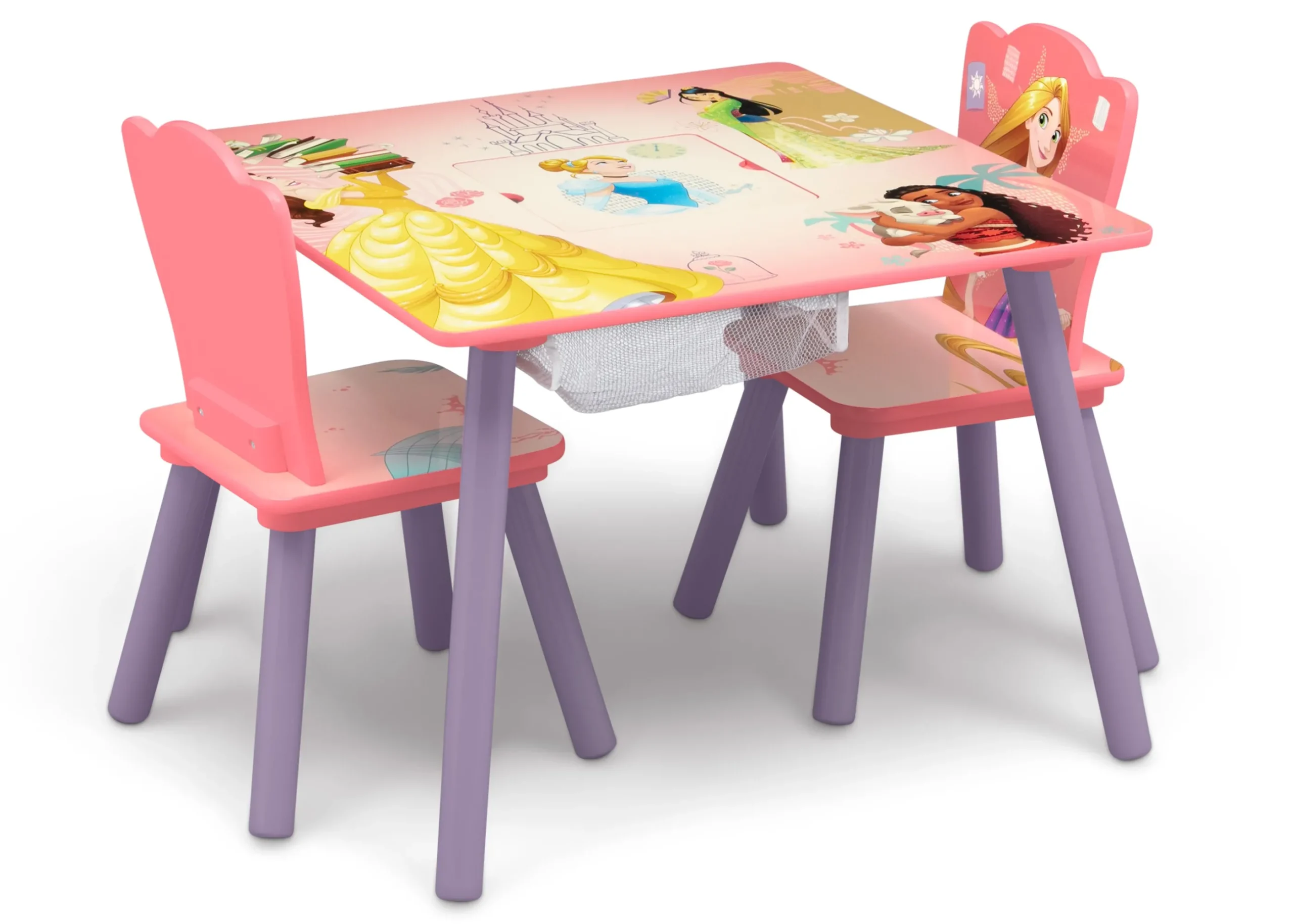 Bring royalty home with this Disney Princess Table and Chair Set with Storage by Delta Children. Featuring colorful graphics of Cinderella, Ariel, Moana, Belle, Mulan and Rapunzel, this table and chair set will spark imaginations. Making any activity extra-special, this kids table and chair set features a table and two chairs, designed at the perfect kid-sized height, making it ideal for snack time, playtime or homework. Plus, a built-in storage compartment at the center of the table provides the perfect space to keep art supplies.
