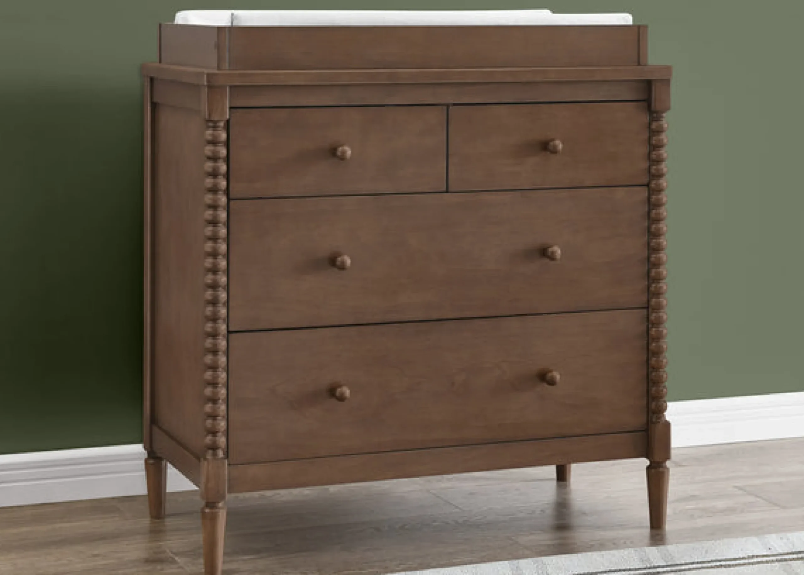 A modern take on vintage-inspired Jenny Lind furniture, the Saint 4 Drawer Dresser with Changing Top and Interlocking Drawers by Delta Children is adorned with solid wood turned posts. A timeless option for your baby’s nursery, it can be styled traditionally, modernly or eclectically, to effortlessly create a look all your own. Designed to grow with your little one, the included changing topper can be easily removed once your child no longer needs a changing table. For your child’s safety, this dresser is outfitted with an interlocking drawer system that limits the number of drawers that can be opened at one time. To complete your nursery, pair the Saint 4 Drawer Dresser with Changing Top with the Saint 4-in-1 Convertible Baby Crib by Delta Children. Changing Pad not included.This Delta Children dresser is tested to meet the current requirements of ASTM F2057, the mandatory CPSC safety standard that protects young children from furniture tip-over incidents. For your children’s safety, only purchase dressers that comply with this standard. For additional security, Delta Children strongly recommends that all dressers in your home be anchored; all Delta dressers include a wall anchor. To learn how to properly secure your dresser, please see the product assembly instructions or visit our website.