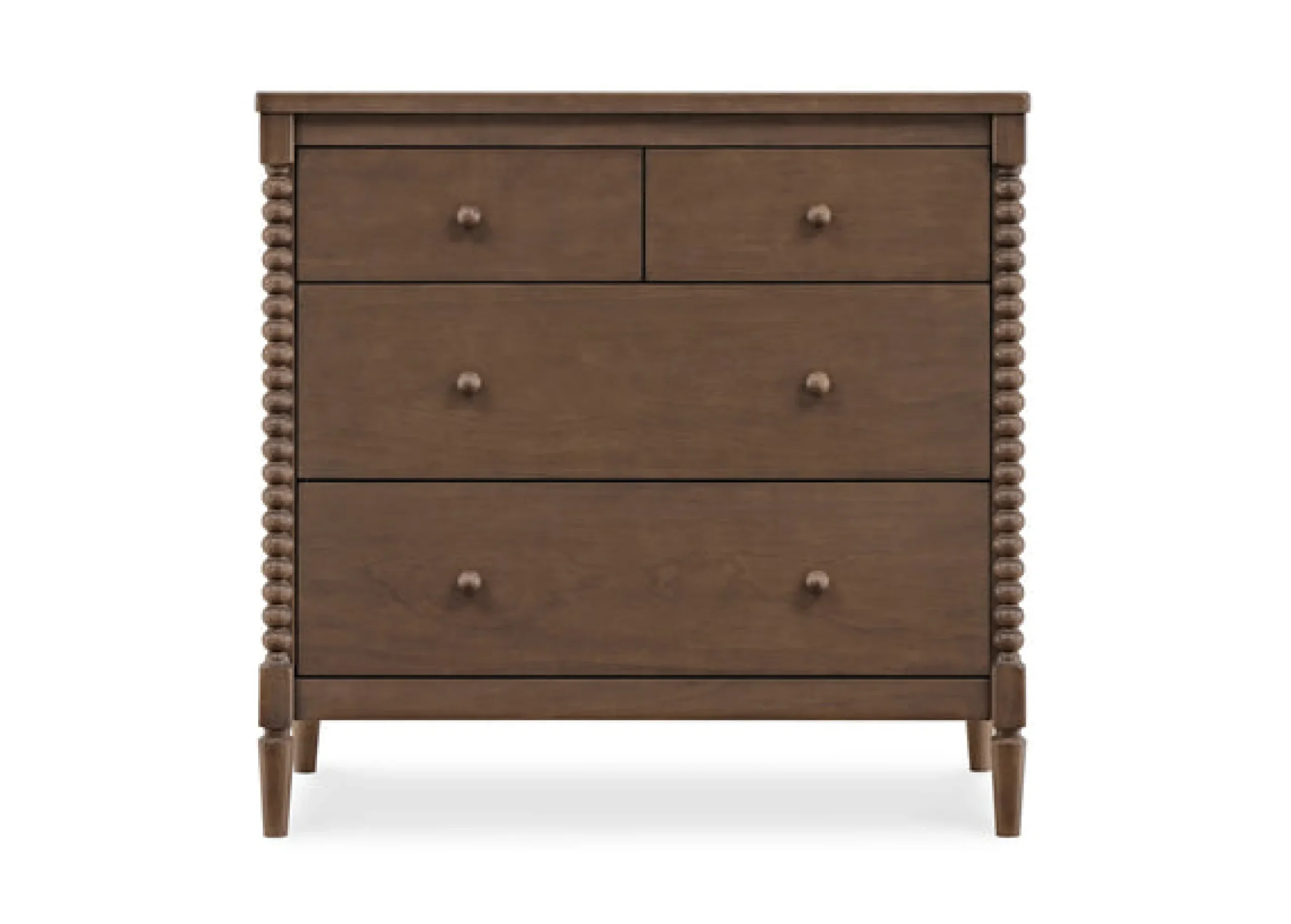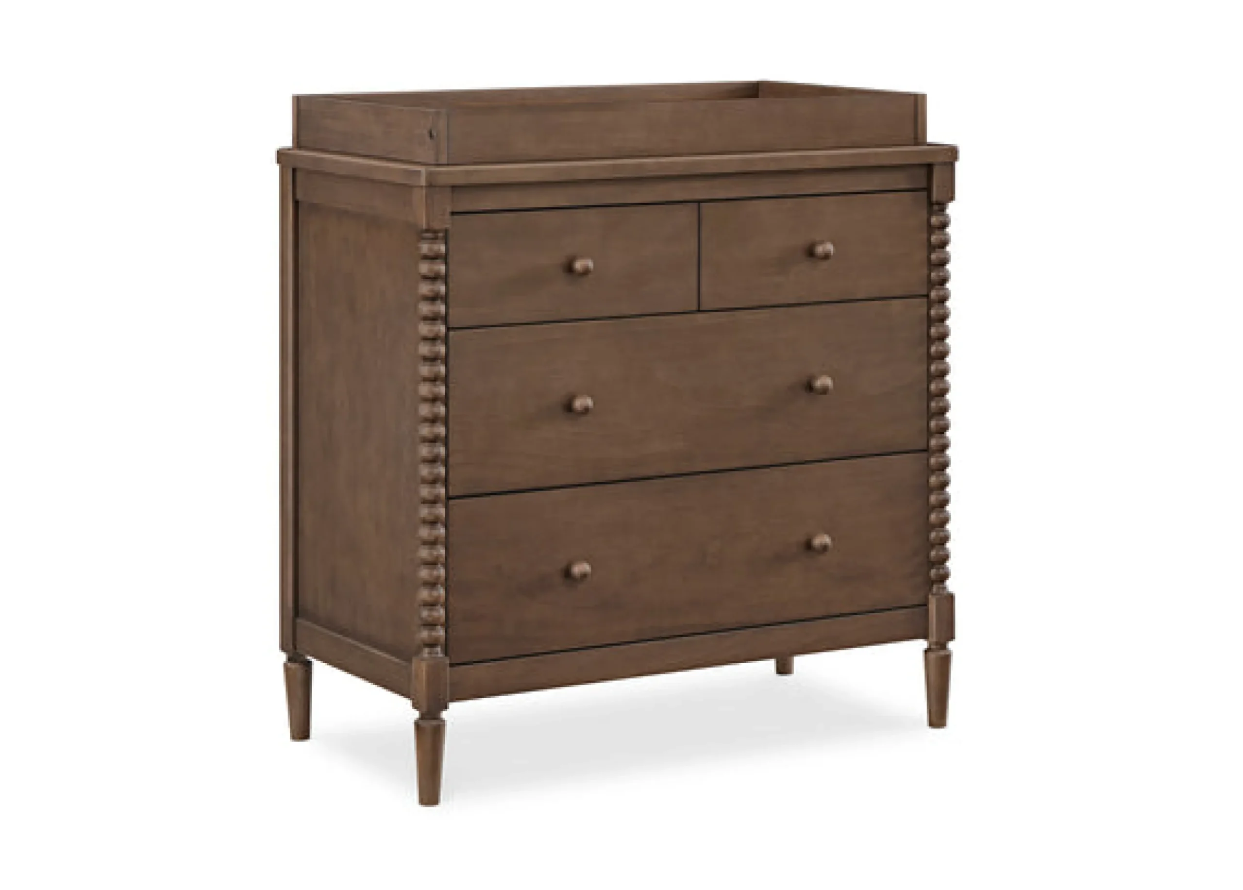 A modern take on vintage-inspired Jenny Lind furniture, the Saint 4 Drawer Dresser with Changing Top is adorned with solid wood turned posts