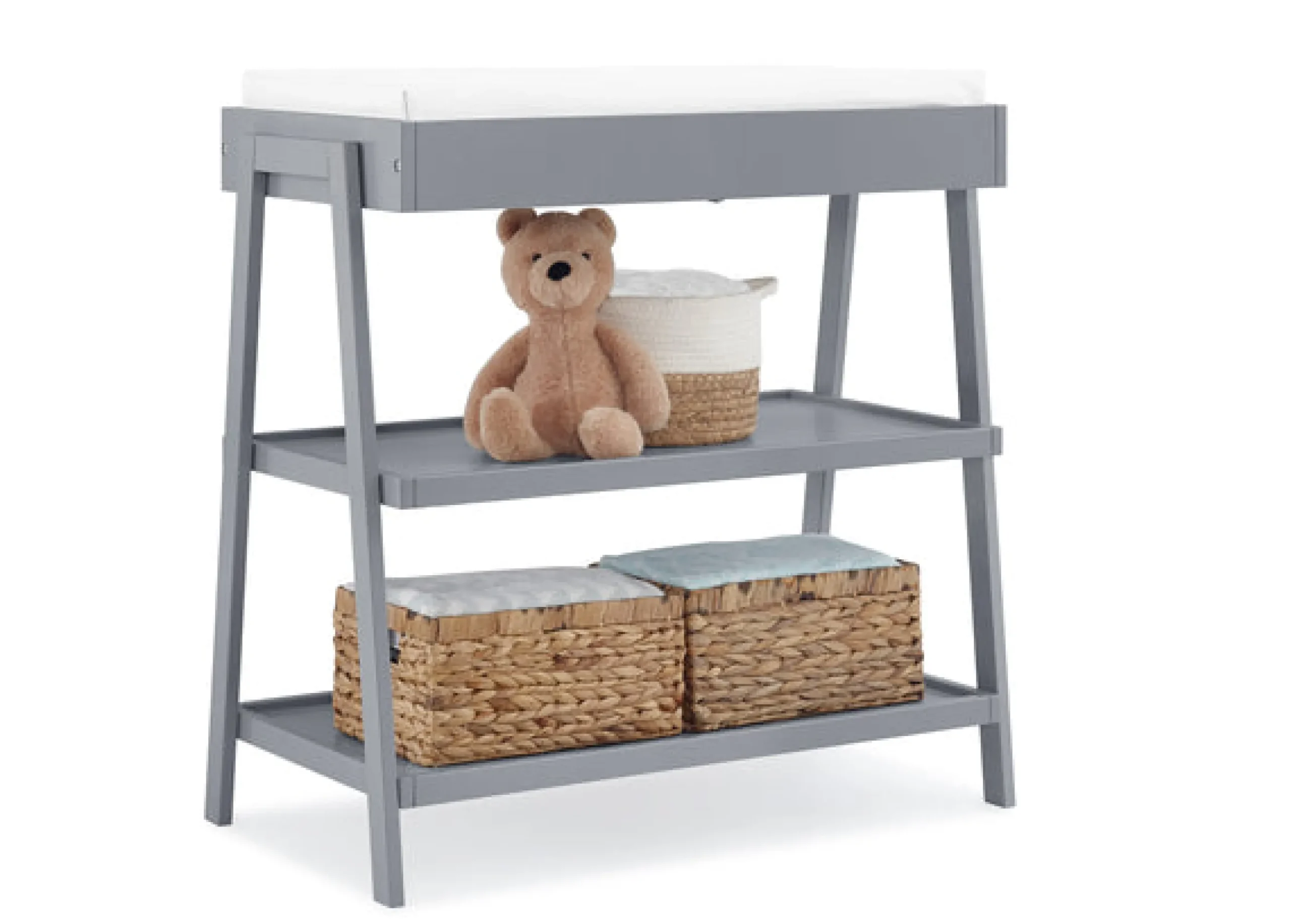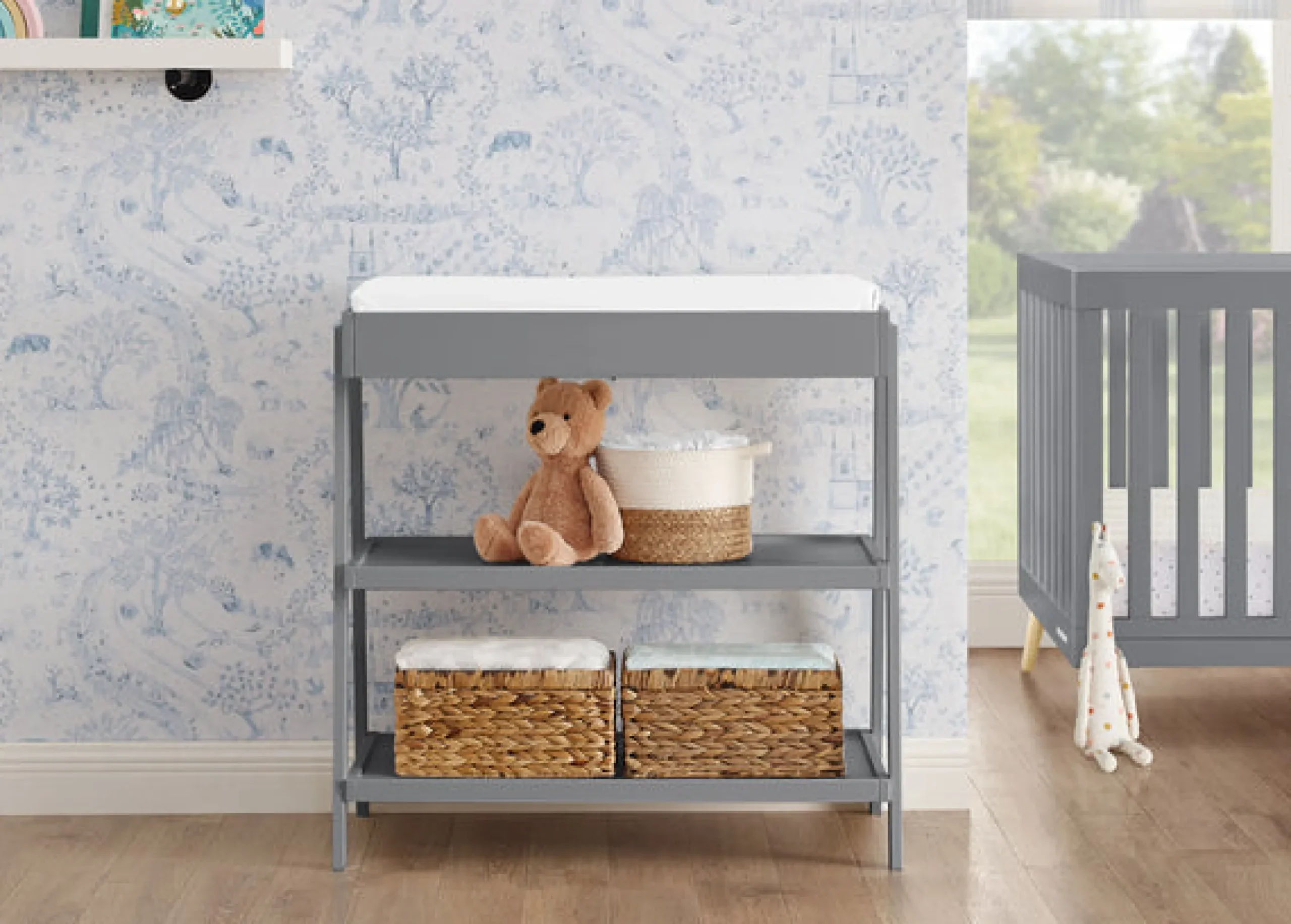 The Scout Changing Table by Delta Children is a must-have for your nursery. The contemporary design of this changing table goes with any style. Crafted with two open shelves, this changing table makes it easy to store (and grab) diapers, wipes and other essentials. A standout piece for years to come, this changing table can also be used as a storage piece or bar cart later on. Plus, this changing table is GREENGUARD Gold Certified, which means it’s built to contribute to cleaner air for a healthy home. Pair this changing table any Delta Children crib in the same finish for a complete nursery. Changing pad sold separately.