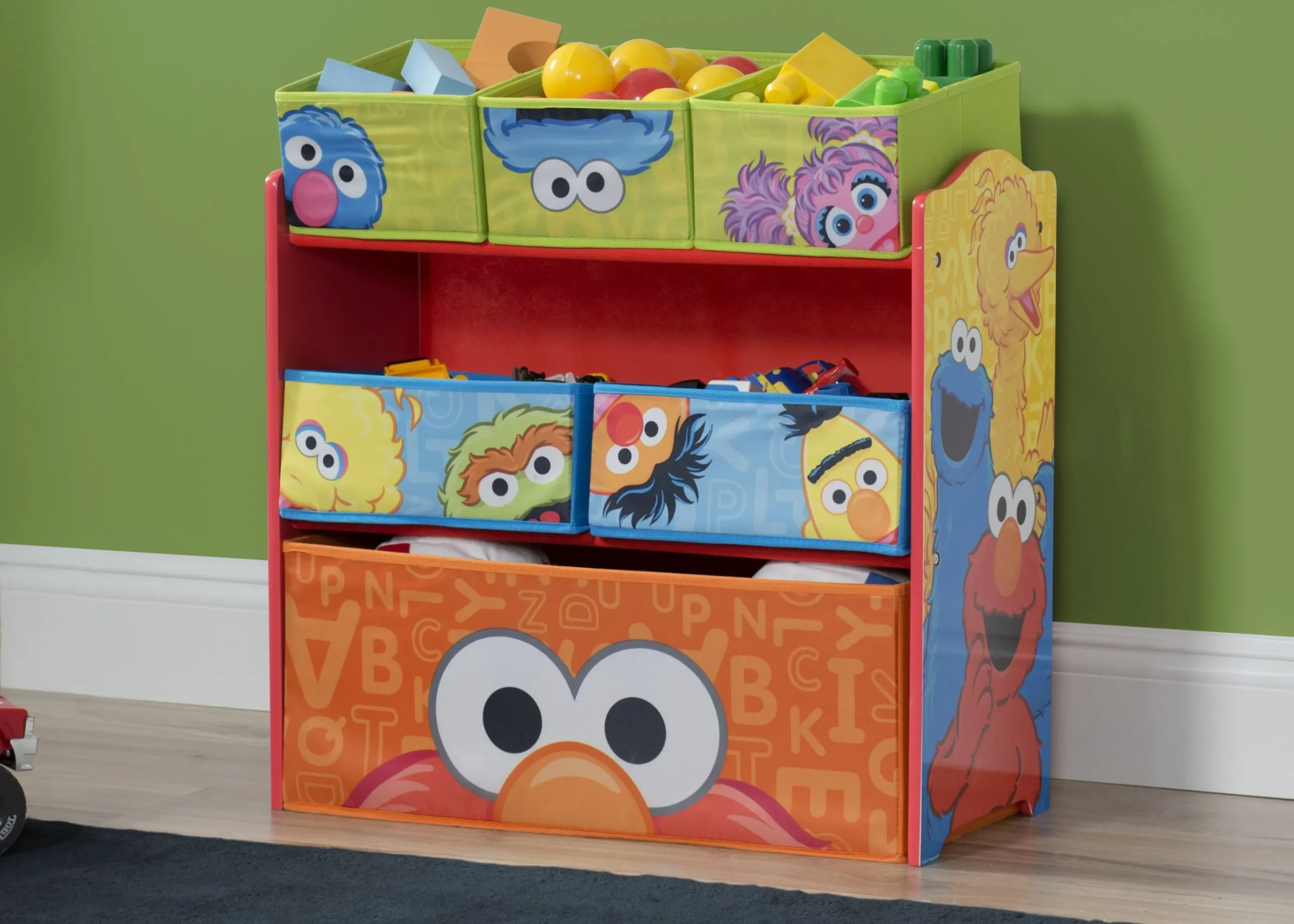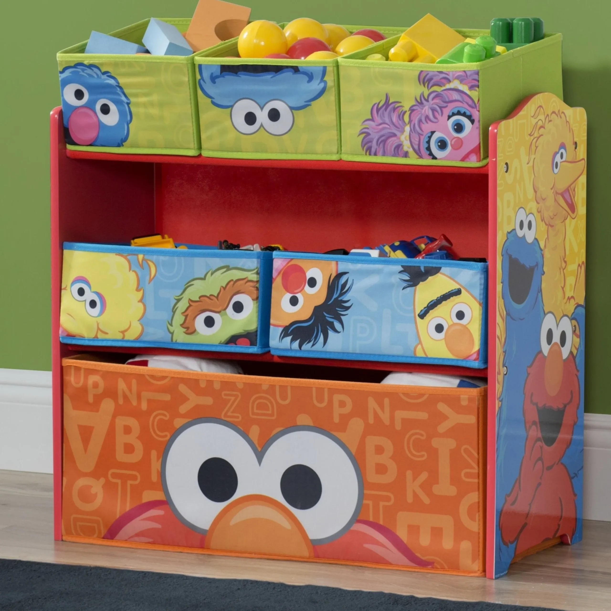 Can you tell me how to get…the kids to clean their room? With this Sesame Street Multi-Bin Toy Organizer from Delta Children, of course! Supported by sturdy wooden frame, it features six fabric bins and colorful images of the whole Sesame Street gang.A fun option for easy organization of toys large and small, it encourages kids to clean up in record time.