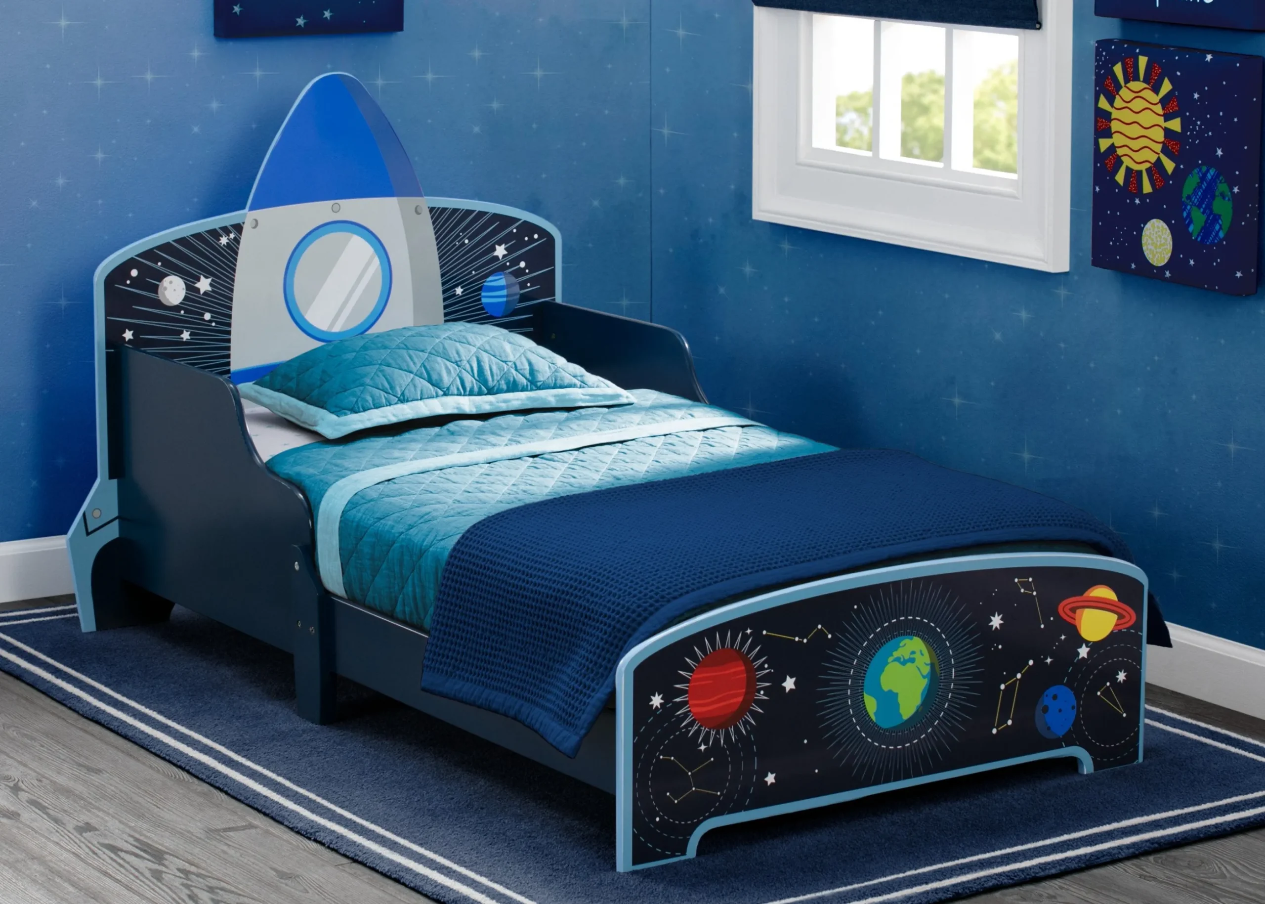 The rocketship-shaped headboard, stars, and planets add an extraterrestrial touch to your toddler’s room