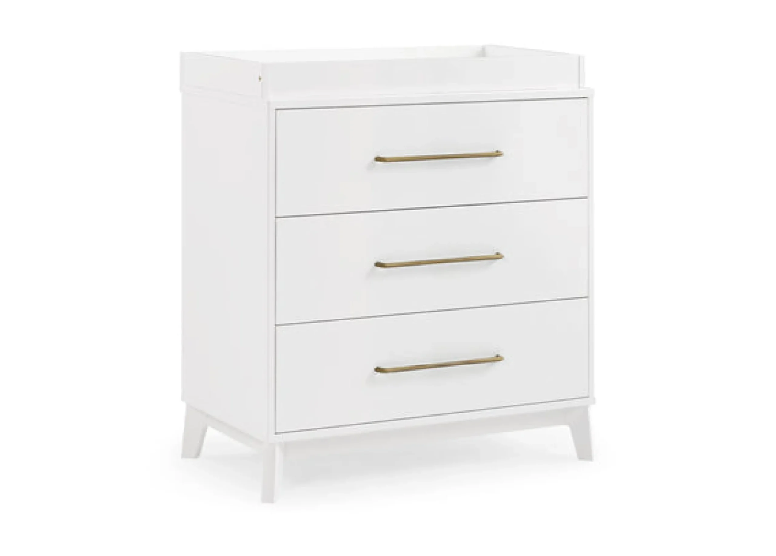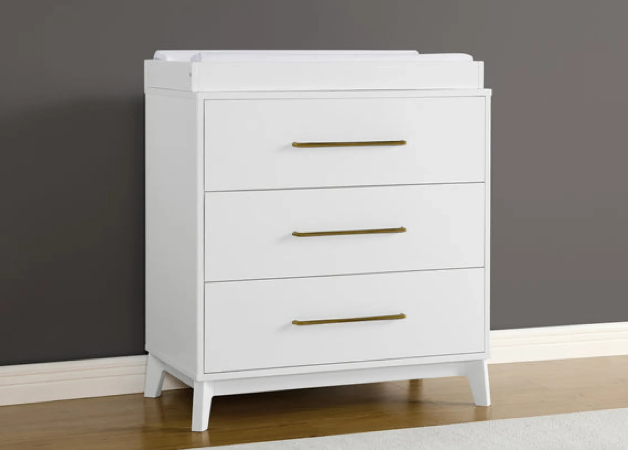 The mid-century design of the Spencer 3 Drawer Dresser with Changing Top by Delta Children anchors nurseries or kids’ bedrooms with timeless style. You’ll love the antique brass drawer pulls and angled feet. Designed with everlasting style in mind, this spacious storage piece serves as a sturdy changing table too, with the included changing topper (changing pad sold separately). When your child grows, just remove the topper, it easily transitions into a stand-alone dresser. For your child’s safety, this dresser is outfitted with an interlocking drawer system that limits the number of drawers that can be opened at one time. Available in Bianca White, Steel Grey and Teak Brown. To complete the look, pair this dresser with the coordinating Spencer 6-in-1 Convertible Crib.This dresser is tested to meet the current requirements of ASTM F2057, the mandatory CPSC safety standard that protects young children from furniture tip-over incidents. For your children’s safety, only purchase dressers that comply with this standard. For additional security, Delta strongly recommends that all dressers in your home be anchored; all Delta dressers include a wall anchor. To learn how to properly secure your dresser, please see the product assembly instructions or visit our website.