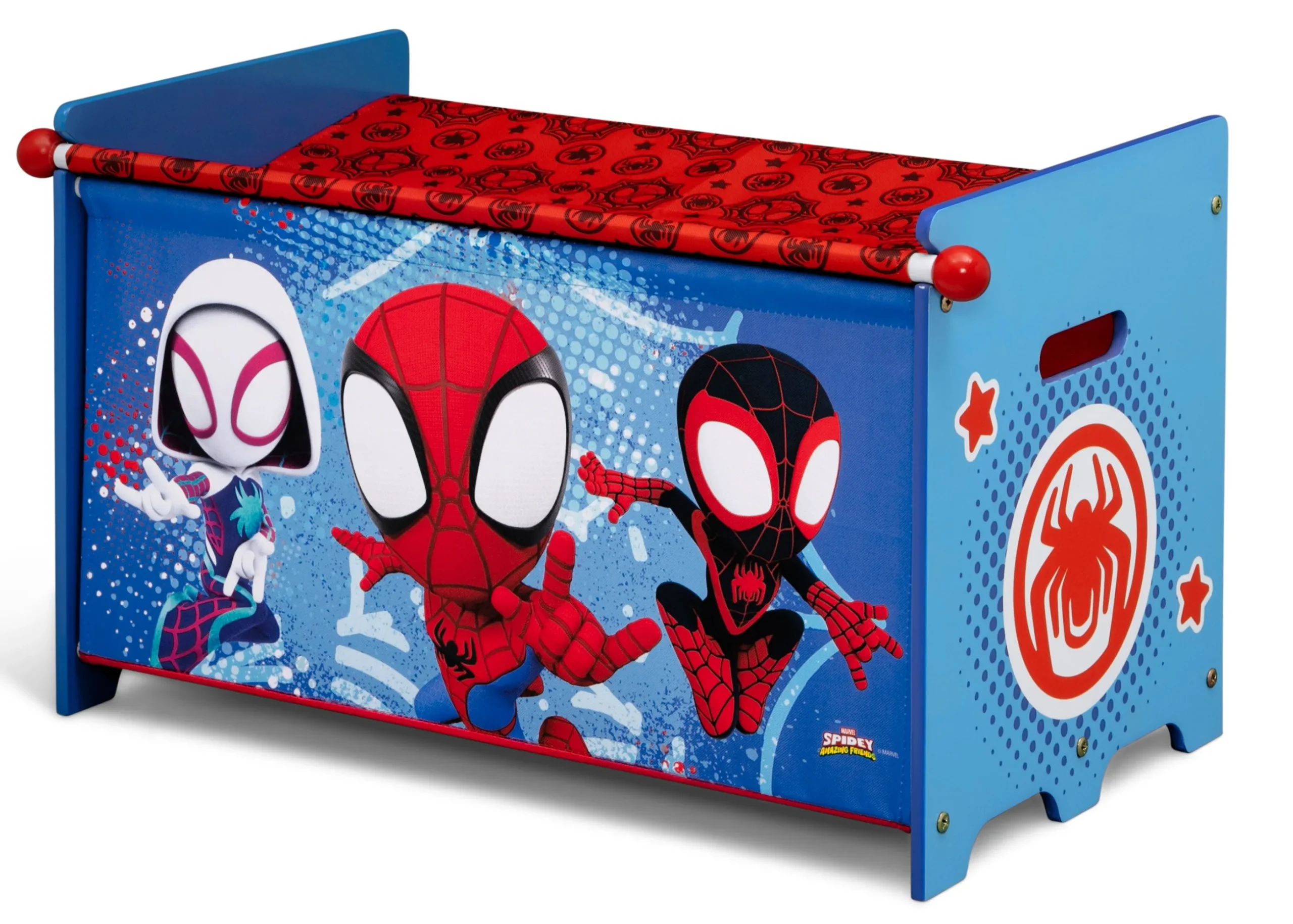 Your wall-crawling superhero will enjoy cleaning up with this Spidey and His Amazing Friends Toy Box with Retractable Fabric Top by Delta Children! Perfect for keeping your little one’s toys, dress up clothes or games organized, this sturdy storage piece features a spacious interior and durable wood construction with rounded corners, smooth edges and a retractable fabric lid for your little one’s safety. Splashed with colorful Spider-Man graphics, this wooden toy box will inspire heroic feats of cleaning.