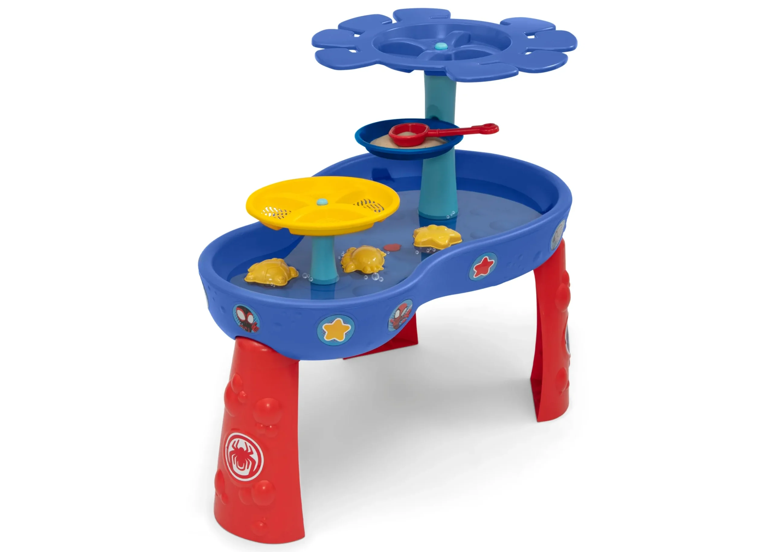 Kids will be amazed by the rotating Spidey waterfall feature and spinning waterfall discs. Colorful weather-resistant Spidey stickers decorate the water table
