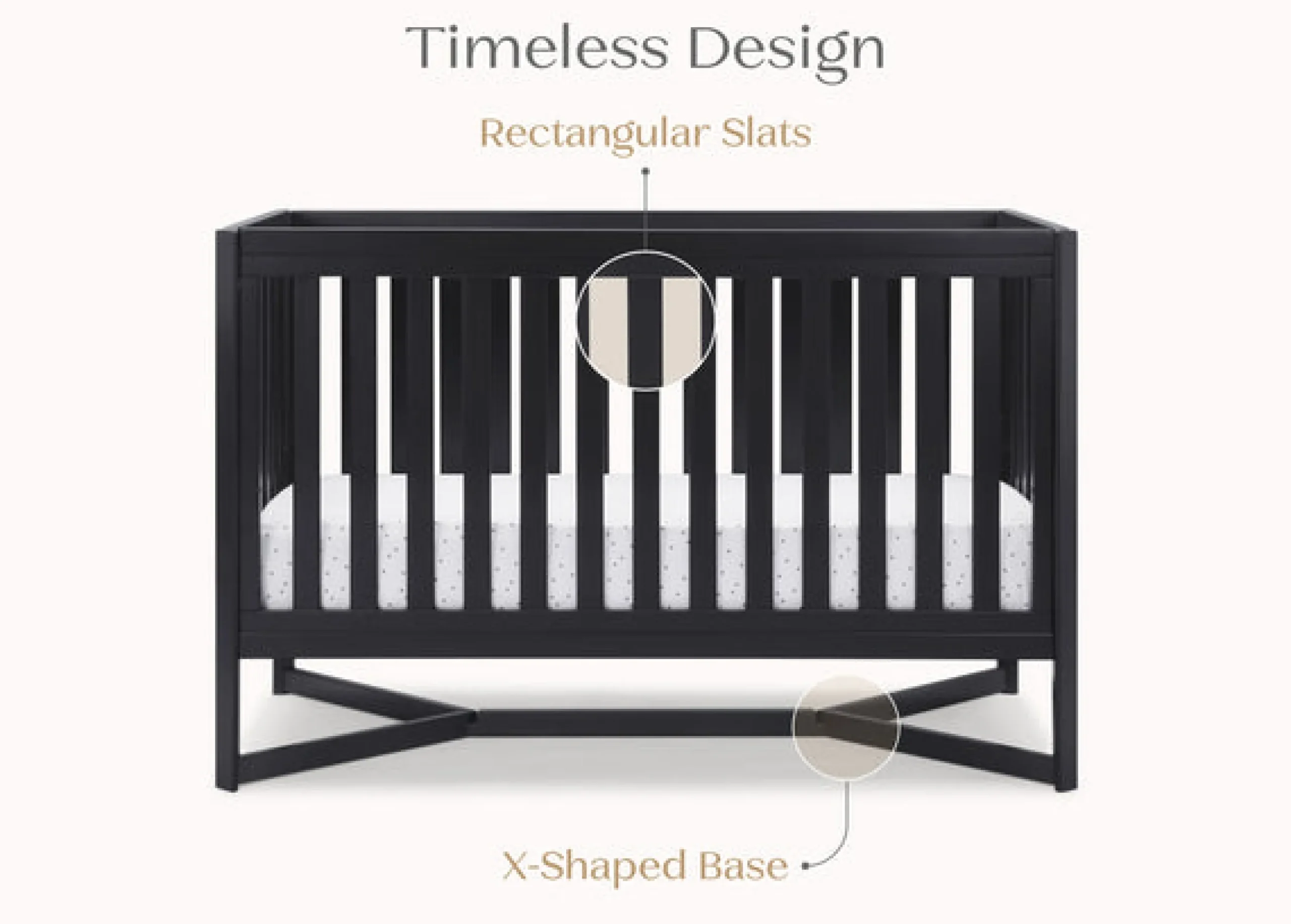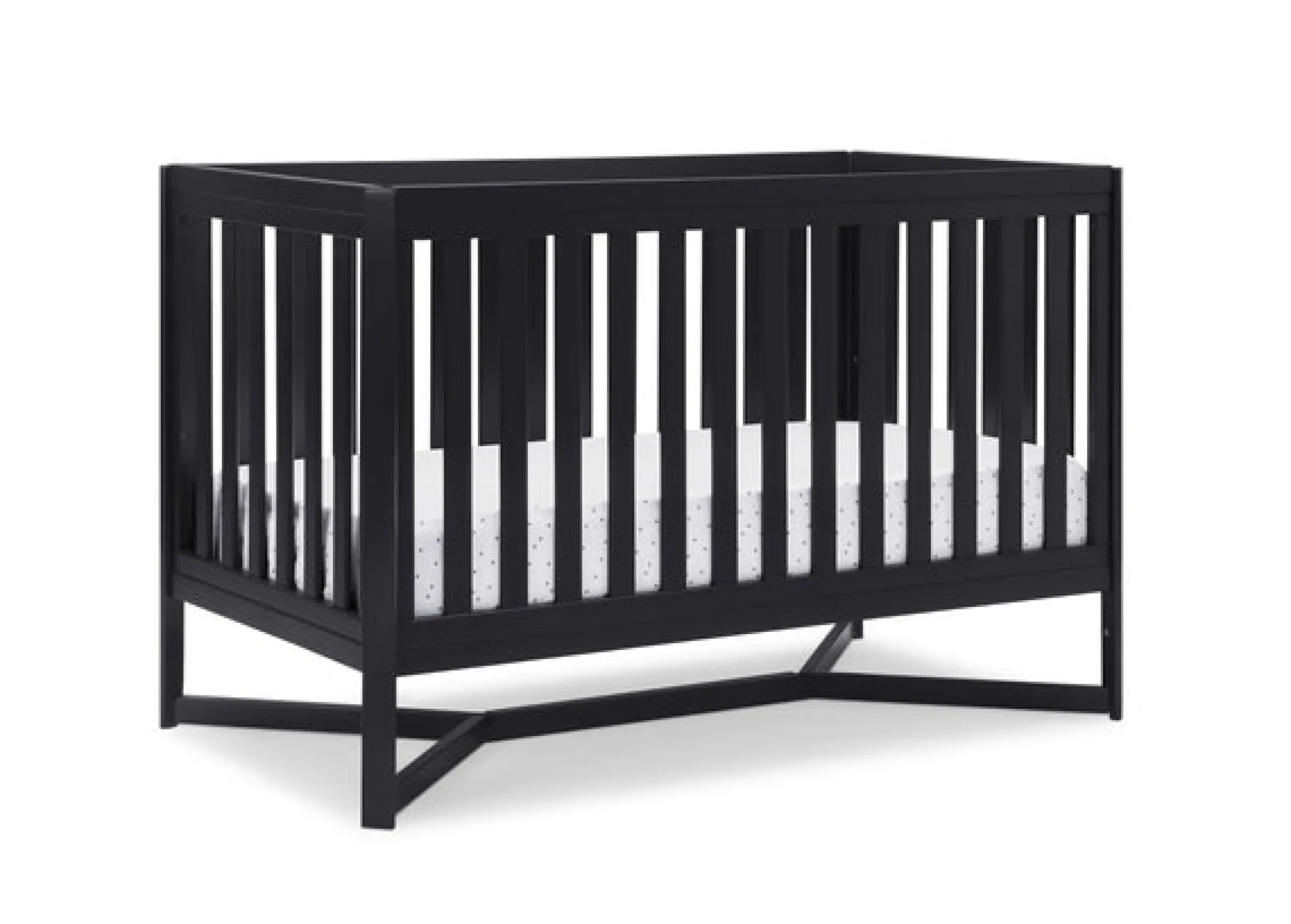 Designed to be the centerpiece of your nursery, the Tribeca 4-in-1 Convertible Crib by Delta Children exudes contemporary cool. Featuring plenty of modern touches it boasts a sleek x-shaped base and airy slats. Crafted from strong and sturdy wood, this crib features three height levels, and converts to a toddler bed, daybed and full size bed, making it the only bed your baby will every need. Toddler Guardrail #0080, Full Size Wood Bed Rails #0050 or Full Size Metal Bed Frame #0040 sold separately.