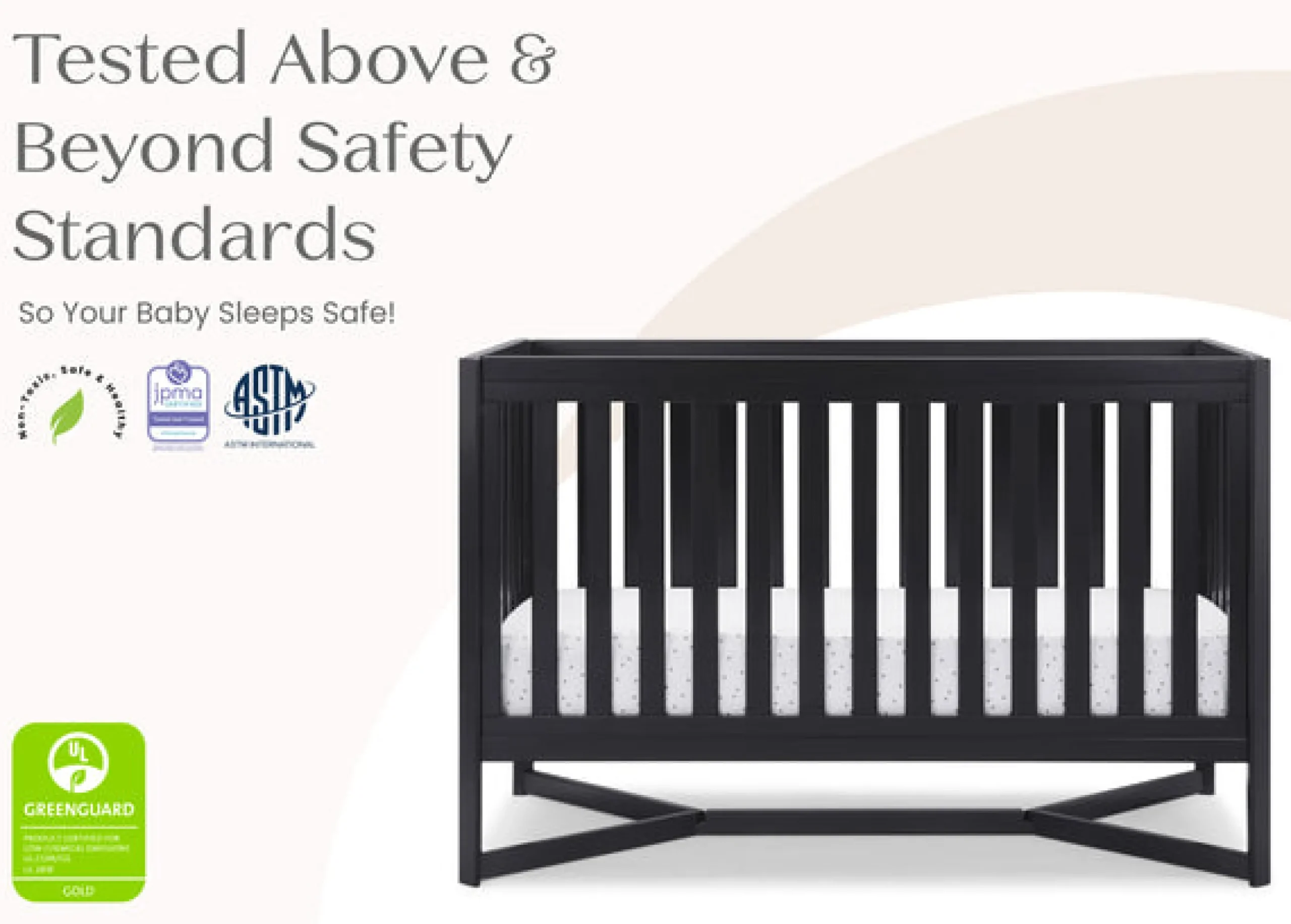 This crib is JPMA certified to meet or exceed all safety standards set by the CPSC & ASTM. We know chemicals have no place in your nursery, so we use a non-toxic multi-step painting process that is lead and phthalate safe. Made of sustainable New Zealand pine wood and TSCA compliant engineered wood