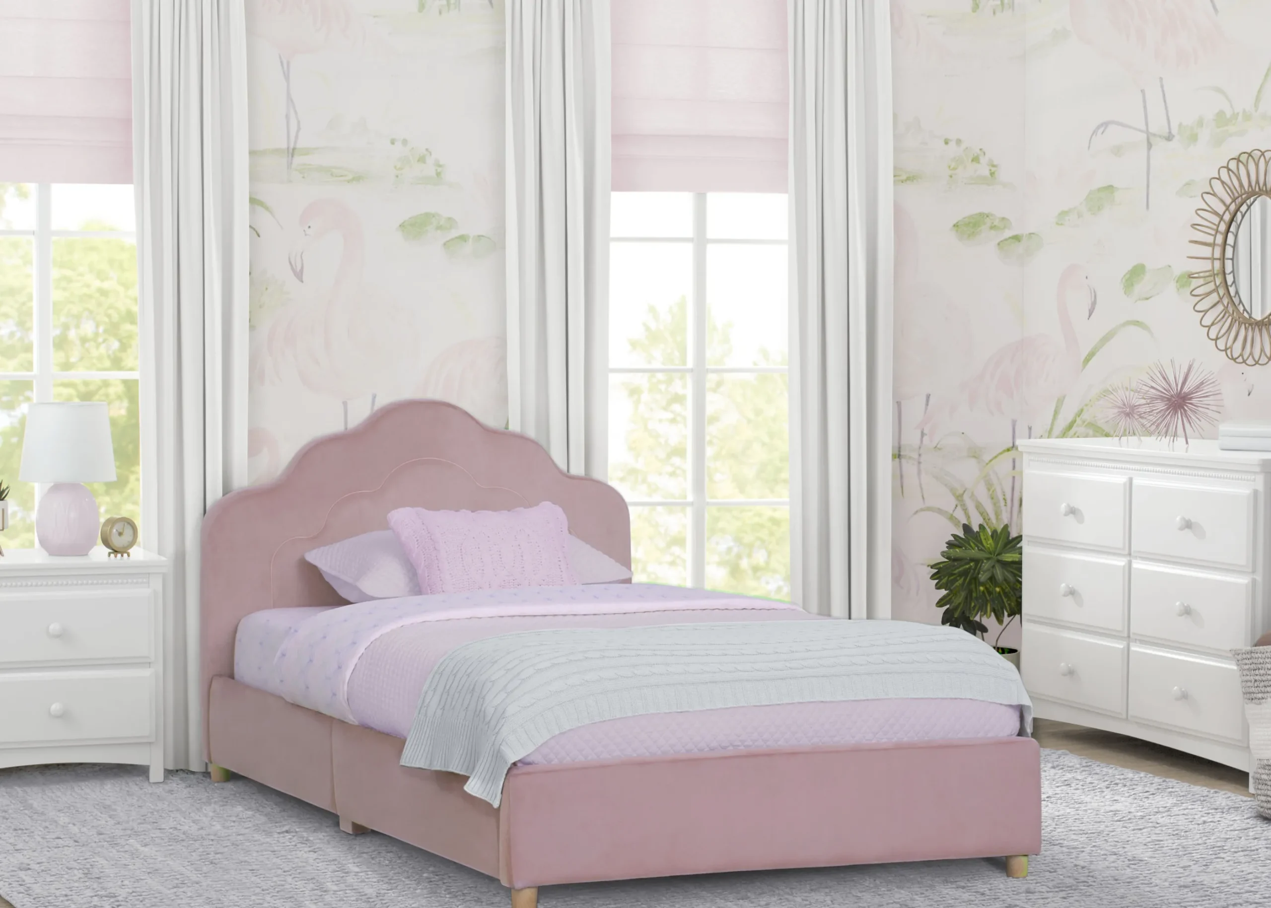 This adorable kids’ twin bed features velvety pink upholstery with a playful scalloped silhouette. Padded headboard ensures long-lasting comfort and support while sitting up to read or watch TV
