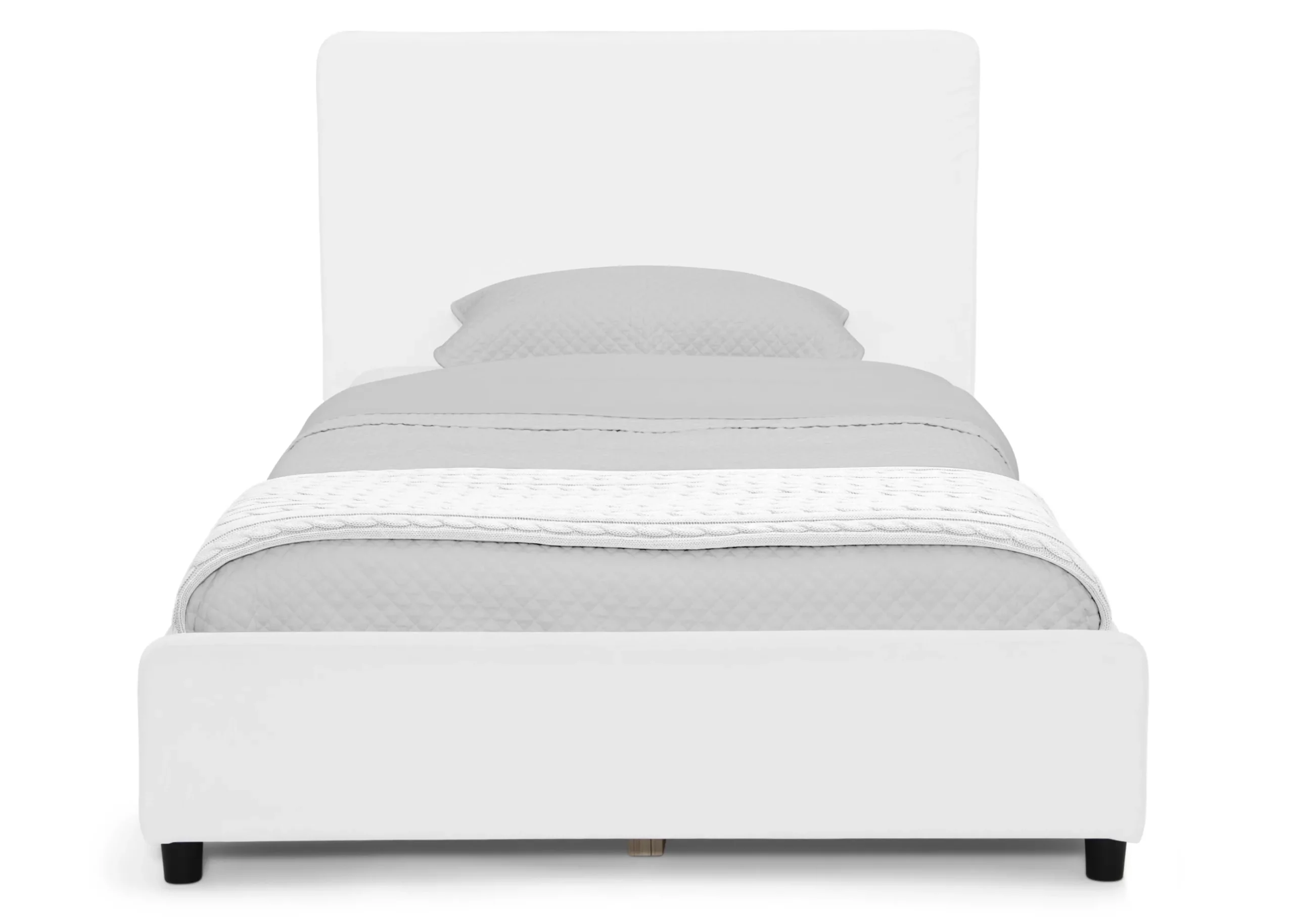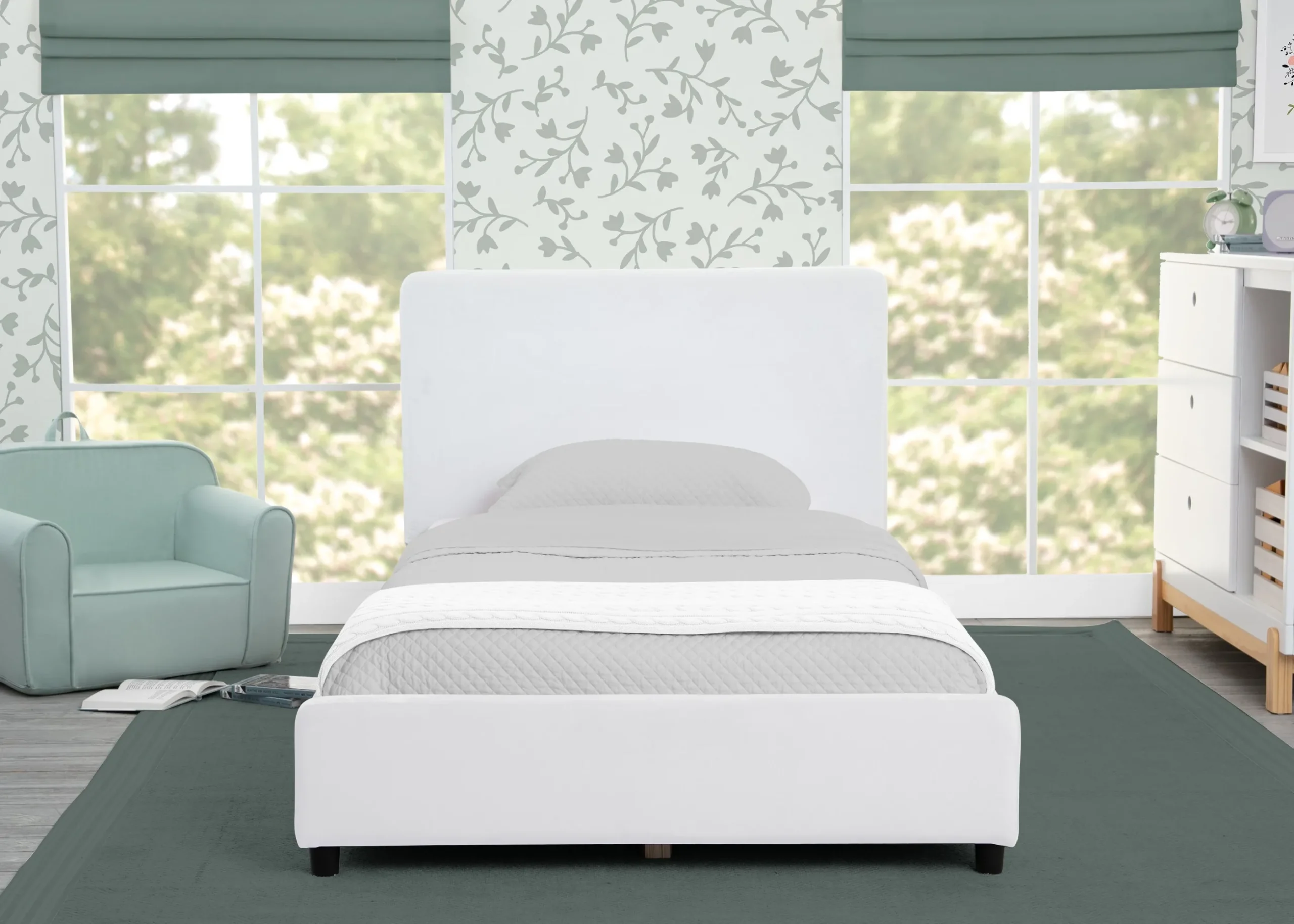 Designed to inspire the sweetest dreams, this Upholstered Twin Bed by Delta Children boasts clean lines and a low profile that’s close to the ground, which makes it easier for your little one to get in and out on their own. Accented with plush upholstery and a generously padded headboard for comfort and support while sitting up to read or watch TV, this cozy twin bed is a must-have for your big-kid’s bedroom. Plus, it’s crafted from quality materials for lasting style and durability. The bed’s wood platform frame with slats eliminates the need for a box spring. Twin mattress sold separately.
