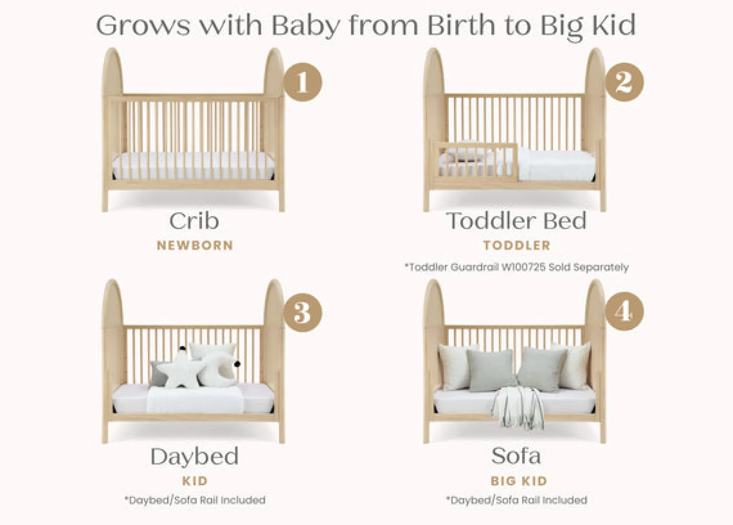 - Crib converts to a toddler bed, daybed and sofa (daybed and sofa conversion included; Toddler Guardrail #W100725 sold separately)