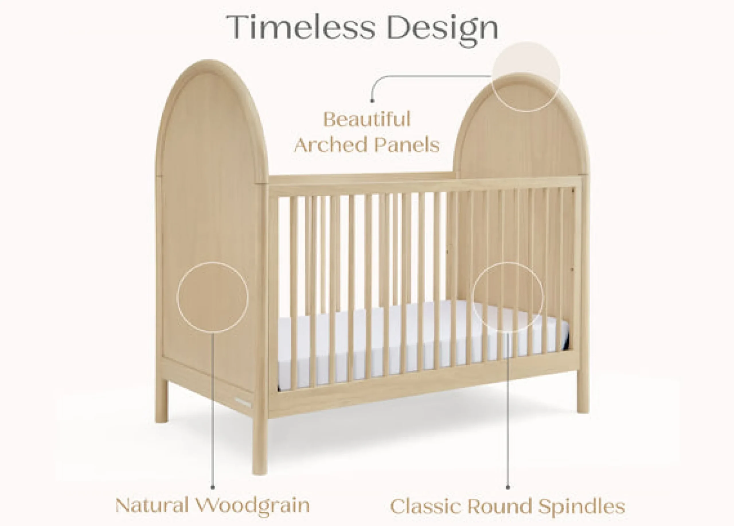 The Vivi 4-in-1 Convertible Crib by Delta Children is an elegant mix of timeless style and contemporary touches. It makes a statement with its round spindles, playfully arched end panels and a multi-step finish that brings out the natural grain variation of the wood for a unique, one-of-a-kind look. Designed to grow with your little one, the Vivi features three mattress heights that can be lowered as you child begins to sit or stand, plus it converts from a crib into a toddler bed, daybed or sofa bed (Daybed and Sofa Rail included, Toddler Guardrail #W100725 sold separately). For peace of mind, this baby crib is screened for harmful chemical emissions to ensure it meets GREENGUARD Gold Certification.